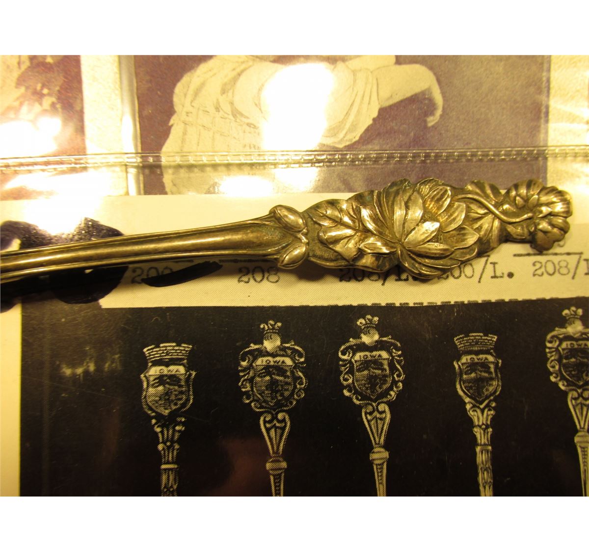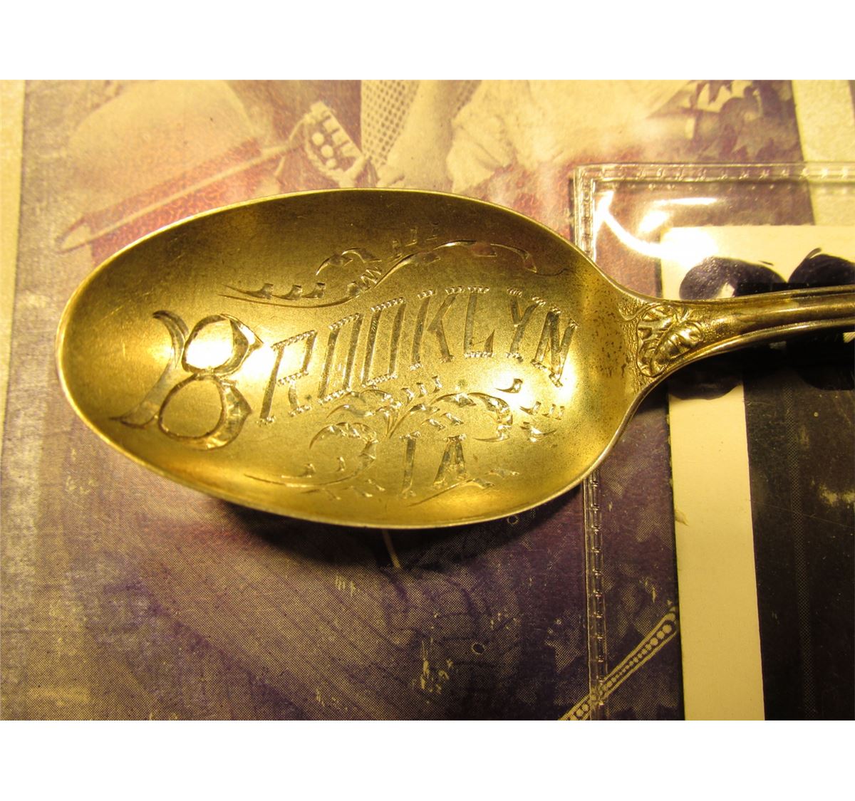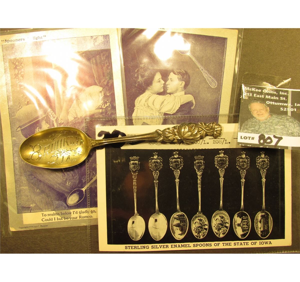 "Brooklyn/Ia" Souvenir Spoon stamped on back "Sterling"; & (3) Old Postcards, first with 2 1/2c of U.S. Postage Stamps on back titled "The Hobby of Collecting Souvenir Spoons…", second 1908 "Spooners Delight" and depicts a spoon "To realms below I'd gladly go, Could I but be your Romeo.", & third 1908 "Spooners Delight" and depicts a spoon "It seems tho I'were tearing my heart in two, When it comes to saying Good-bye to you".