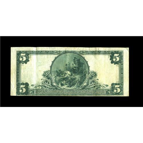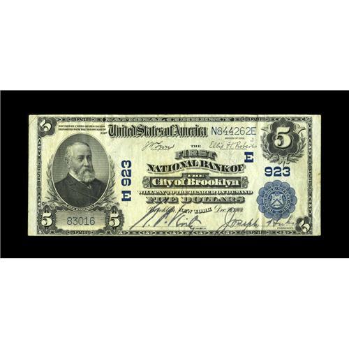 <B>Brooklyn, NY</B></I> - $5 1902 Plain Back Fr. 598 <B>The First NB of the City of Brooklyn</B></I> Ch. # (E)923<BR>An interesting tombstone is a trait of this note that possesses darkly printed signatures. The bottom edge runs along the frame line. <B>Very Fine.</B></I><BR><BR><b>Shipping:</b> Coin/Currency (<a target="_blank" href="http://www.heritageauctions.com/common/shipping.php">view shipping information</a>)