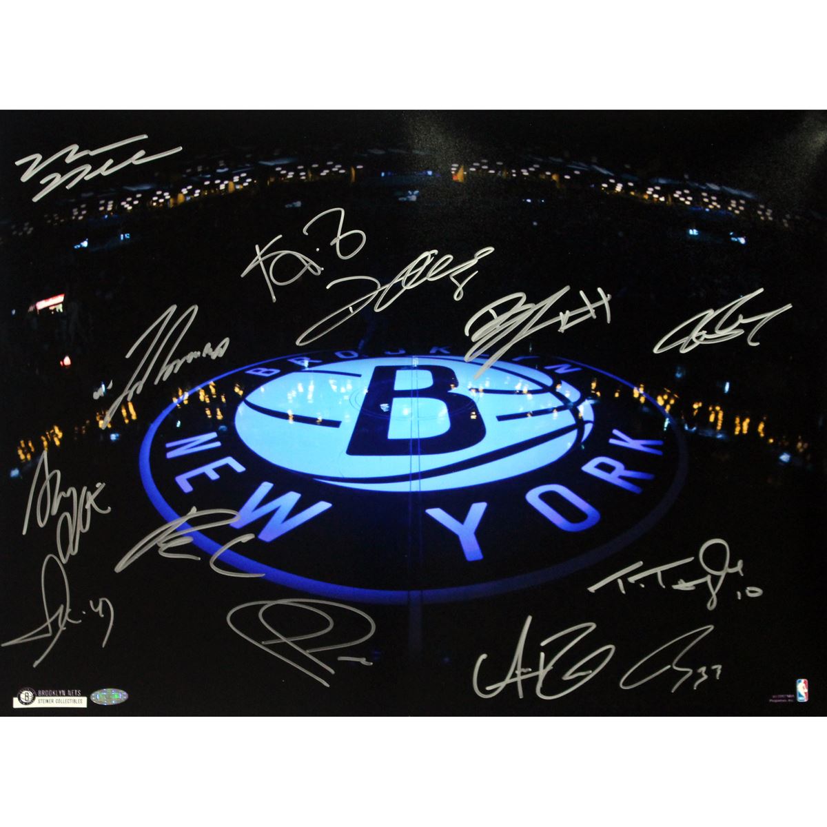 Brooklyn Nets Team Signed “B” Logo Lit Up on Dark Court 16x20 Photo