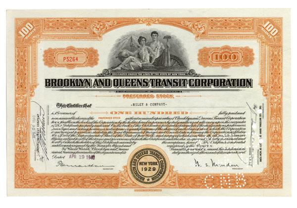 1940, New York. Stock certificate for 100 shares. Orange/Black. Vignette of two allegorical figures at top center. Lightly punch cancelled and Extremely Fine.