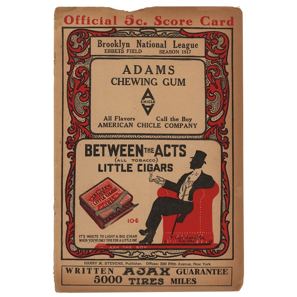 Original "Brooklyn National League / Ebbets Field, Season 1917" program and scorecard for the game between the Brooklyn Robins and the New York Giants on April 18, 1917, 12 pages, 6.5 x 10, with the centerfold scorecard filled out in pencil. Among the players listed on the scorecard are 'High Pockets' Kelly and Jim Thorpe for the New York Giants, and Rube Marquard, Zack Wheat, and Casey Stengel for the Brooklyn Robins (later known as the Dodgers). The back cover has an interesting ad for Sweet Caporal cigarettes depicting the roster of Brooklyn's first ball team, the Atlantics. In very good condition, with a central vertical fold, some toning and chipping to edges, and partial separation to spine.