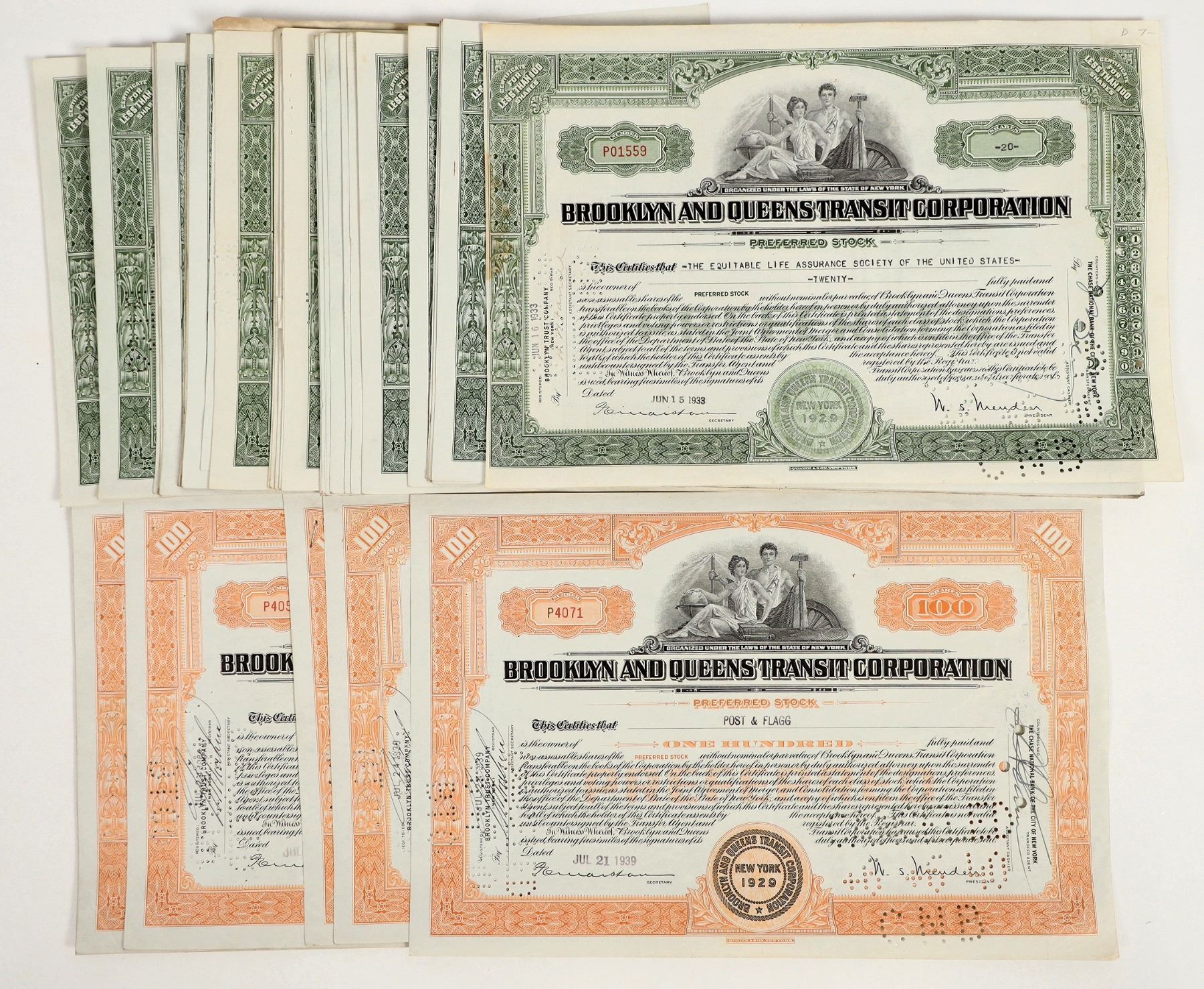 There are over 50 preferred stock certificates for the Brooklyn and Queens Transit Corp. issued in 1933. These stock are marked 1932-1940. Seven are for 100 shared the rest are less than 100 shares certificates. Please see photo for details.