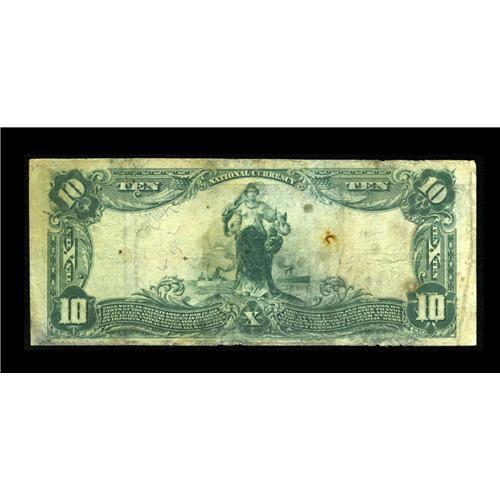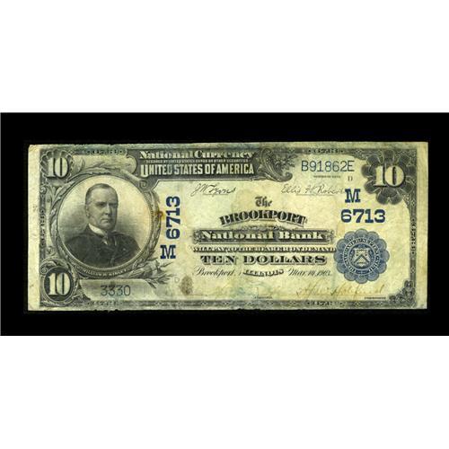 <B>Brookport, IL</B></I> - $10 1902 Plain Back Fr. 624 <B>The Brookport NB</B></I> Ch. # (M)6713<BR>A very scarce bank, with just four large and seven small notes listed in the Kelly census. This addition makes a fifth and is the first $10 Plain Back to surface. This otherwise <B>Fine</B></I> note does show some margin roughness and displays scattered staining, but what it lacks in aesthetic appeal is more than compensated for by its scarcity both as an issuer and type. We anticipate bids in the range of...<BR><BR><b>Shipping:</b> Coin/Currency (<a target="_blank" href="http://www.heritageauctions.com/common/shipping.php">view shipping information</a>)