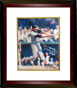 Brooks Robinson played his entire 23-year career with the Baltimore Orioles and was elected to the Baseball Hall of Fame in 1983. He began his professional baseball career as an 18 year old with the Orioles, and gained great renown for his fielding ability. Nicknamed "The Human Vacuum Cleaner", he is generally acclaimed as the greatest defensive third-baseman of all time. He won 16 consecutive Gold Glove Awards during his career. Brooks Robinson has hand autographed this Baltimore Orioles 8x10 Photo with HOF 83 inscription. MLB/Ironclad Holograms and Certificate of Authenticity from Ironclad Authentics. Custom White Mat and Premium Mahogany Color Framed as shown.