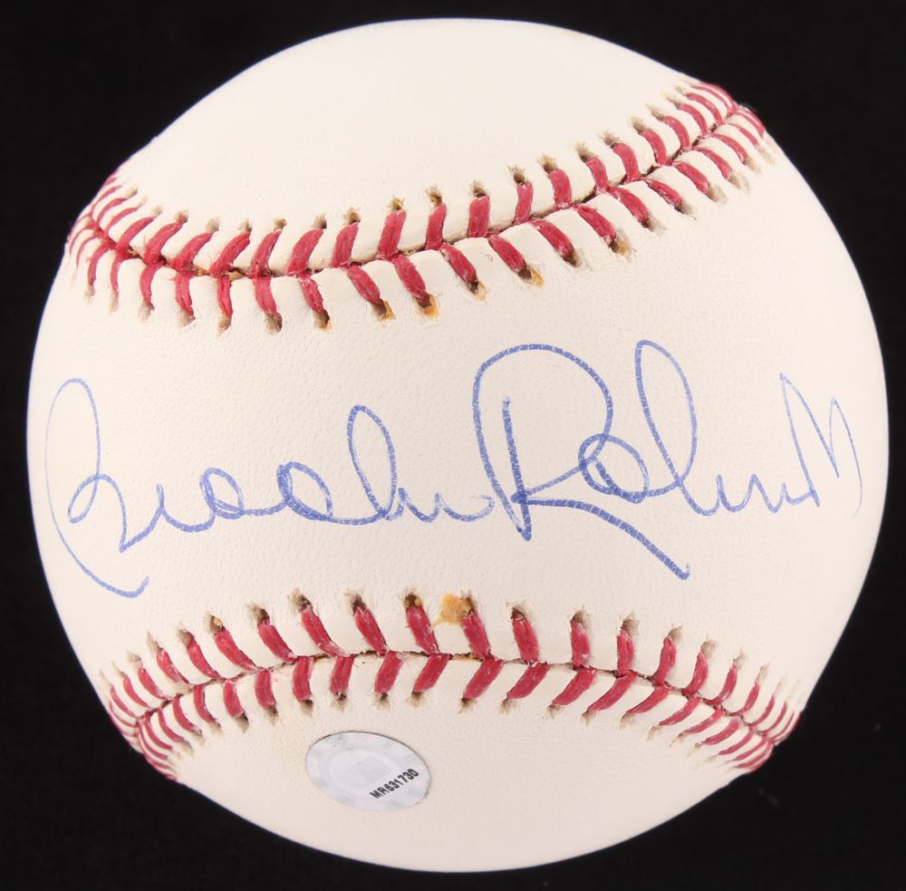 Rawlings Official Major League baseball has been hand-signed in blue ink pen by Brooks Robinson (Orioles, HOF). Please note, baseball shows signs of natural toning.