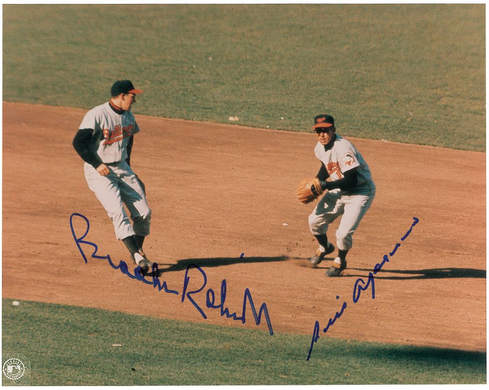 Color glossy 10 x 8 action photo of Robinson and Aparicio fielding a play, signed in blue felt tip by both. In fine condition.