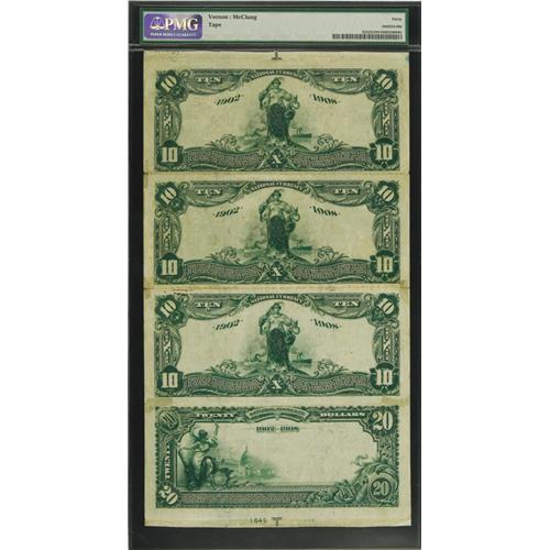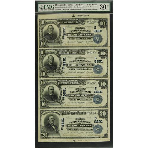 <B>Brooksville, FL</B></I> - $10-$10-$10-$20 1902 Date Back Fr. 619/645 <B>The First NB </B></I>Ch. # (S)9891 Uncut Sheet<BR> A fantastic item which is one of the highlights of the Sunshine State collection. This is one of only five large size uncut sheets known from the entire state of Florida, and the only serial number 1 large size sheet reported to date. Only three single notes are known from this rare bank, as well as two uncut sheets, both of which are offered here, with the other sheet never having before been offered at public sale and this sheet having only one offering, with that coming back in a 1956 Abe Kosoff auction. Any estimate here is simply a guess, as this unique serial number 1 sheet has not been available to collectors in over fifty years, but this sheet, which PMG has graded <B>Very Fine 30 Net</B></I> because of a bit of tape on the reverse should easily reach or exceed...<BR><I>From The Sunshine State Collection.</B></I><BR><BR><b>Shipping:</b> Coins & Currency (<a target="_blank" href="http://www.heritageauctions.com/common/shipping.php">view shipping information</a>)