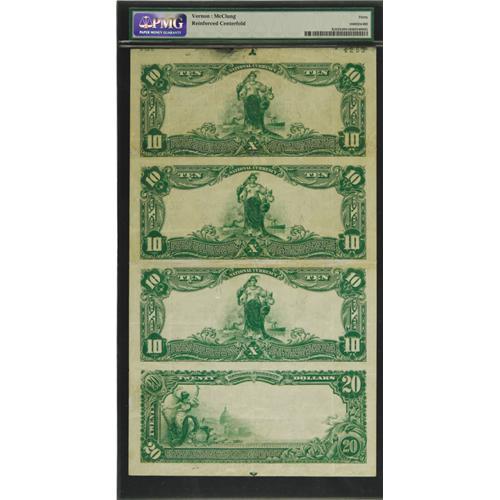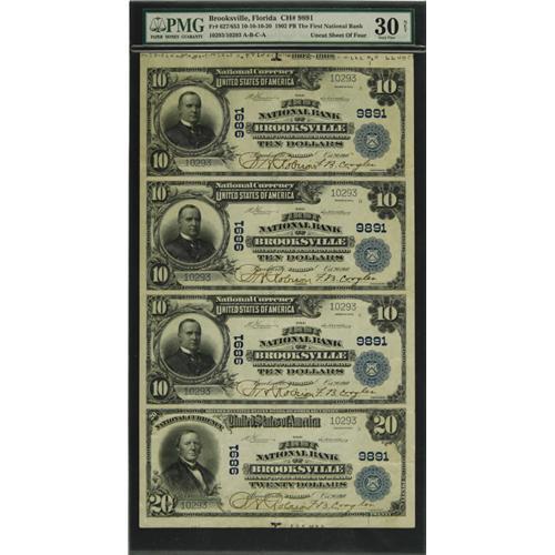 <B>Brooksville, FL</B></I> - $10-$10-$10-$20 1902 Plain Back Fr. 627/653 <B>The First NB</B></I> Ch. # 9891 Uncut Sheet<BR> The second of the two uncut sheets known from Brooksville, and one of just five uncut large size sheets known from the entire state. It is most attractive in appearance, with full margins and selvage, bright colors, and bold pen signatures. It has been graded <B>Very Fine 30 Net</B></I> by PMG, with the comment "Reinforced Centerfold," which is indeed visible, although only on the back. If rarity and desirability are any guide here, expect this Sunshine State highlight to reach or exceed...<BR><I>From The Sunshine State Collection.</B></I><BR><BR><b>Shipping:</b> Coins & Currency (<a target="_blank" href="http://www.heritageauctions.com/common/shipping.php">view shipping information</a>)