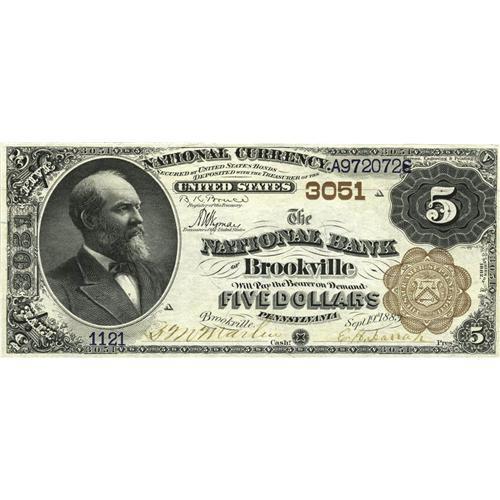 <B>Brookville, PA</B></I> - $5 1882 Brown Back Fr. 467 <B>The NB of Brookville</B></I> Ch. # 3051<BR>While this is hardly a rare bank, the note we offer here is the only Brown Back known from here, and thus offers collectors of fancy layouts their only opportunity to obtain such an item from this institution. Nice pen signed <B>Crisp Uncirculated,</B></I> a real winner of a note which is certain to see some spirited bidding.