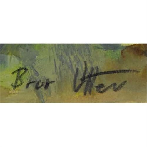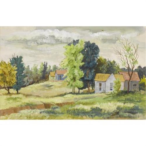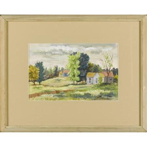 <B>BROR UTTER (American, 1913-1993)</B></I><BR><I>Old Farm House</B></I>, 1944<BR>Watercolor on paper<BR>9 x 13-1/2 inches (22.9 x 34.3 cm)<BR>Signed lower right: <I>Bror Utter</B></I><BR> <BR>PROVENANCE:<BR>David Dike Fine Art, Dallas, Texas (label verso)<B>Condition Report:</B> Overall very good condition, tiny stain in the upper right sky and two tiny paint losses in the clouds to lower left of the stain; mounted in corner triangles.<BR><BR><b>Shipping:</b> Framed - with Glass, Small (<a target="_blank" href="http://www.heritageauctions.com/common/shipping.php">view shipping information</a>)