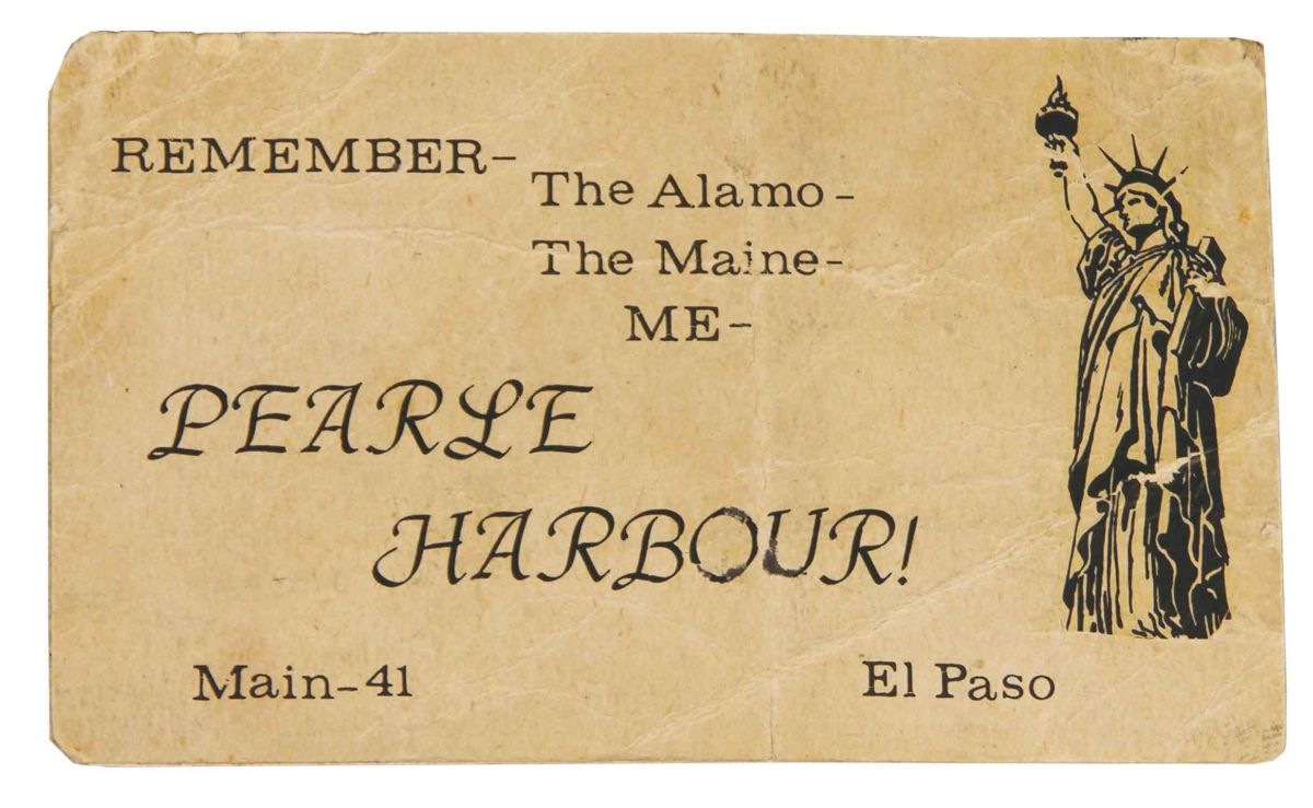 Brothel Calling Card for the Pearle Harbor Brothel in El Paso, TX. Fair to good condition. 4 X 2 1/4 inches.