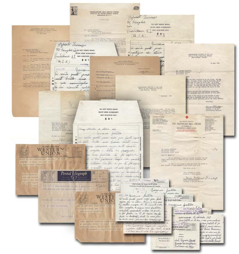 [WWII] Unusual War correspondence lot of 19 pieces between an Italian Prisoner of War, Cesario Espisito, who is being held at Camp Wheeler in Georgia, and his brother, Lorenzo Espisito, who is trying to contact him. The group consists of eight “PRISONER OF WAR” marked correspondence, with the U.S. Censored stamp. Written in Italian and untranscribed, Cesario relates his sad story to his sibling, who is an American citizen. Lorenzo’s attempts to visit him consist of Western Union telegrams from the Red Cross as well as “Headquarters Army Service Forces” letterhead signed by Colonel Breese from the POW Division and Captain Boudreaux, the Intelligence Officer at the Headquarters of the Camp. Among the details noted in this correspondence are that “a number of our prisoners were transferred temporarily to Fort Benning” and that in the near future Cesario may be transferred from Camp Wheeler to an “unknown destination.” Fascinating lot that highlights the poignant struggle of two brothers who find themselves on opposite sides of World War II.