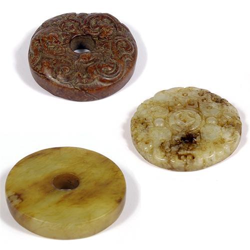 <Our item number 140741><B>Brown Archaic Jade Bi, 206-220 BC.</B> 2 in., three Dragons with archaistic scroll on back. <BR>Estimated Value $3,000 - 5,000. <BR><BR>Our item number 140741<BR><IMAGES><P ALIGN="CENTER"><IMG SRC="http://www.goldbergcoins.net/liveauction/49jpegs/140741.jpg"> <BR><IMG SRC="http://www.goldbergcoins.net/liveauction/49jpegs/140741N2.jpg"> <BR><IMG SRC="http://www.goldbergcoins.net/liveauction/49jpegs/140741N3.jpg"> </P></IMAGES>