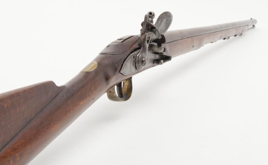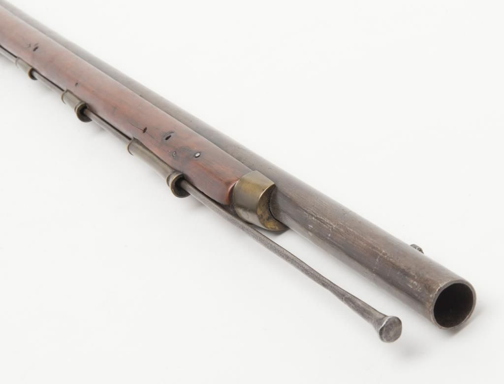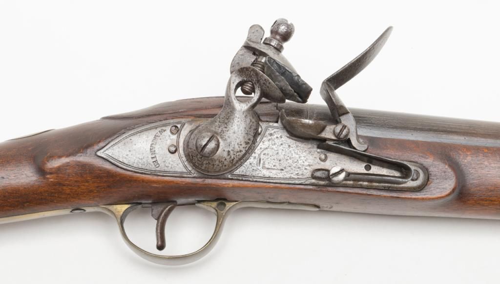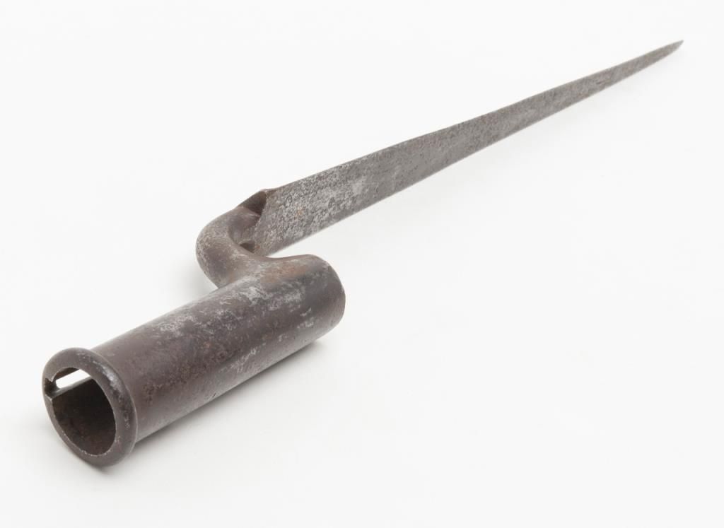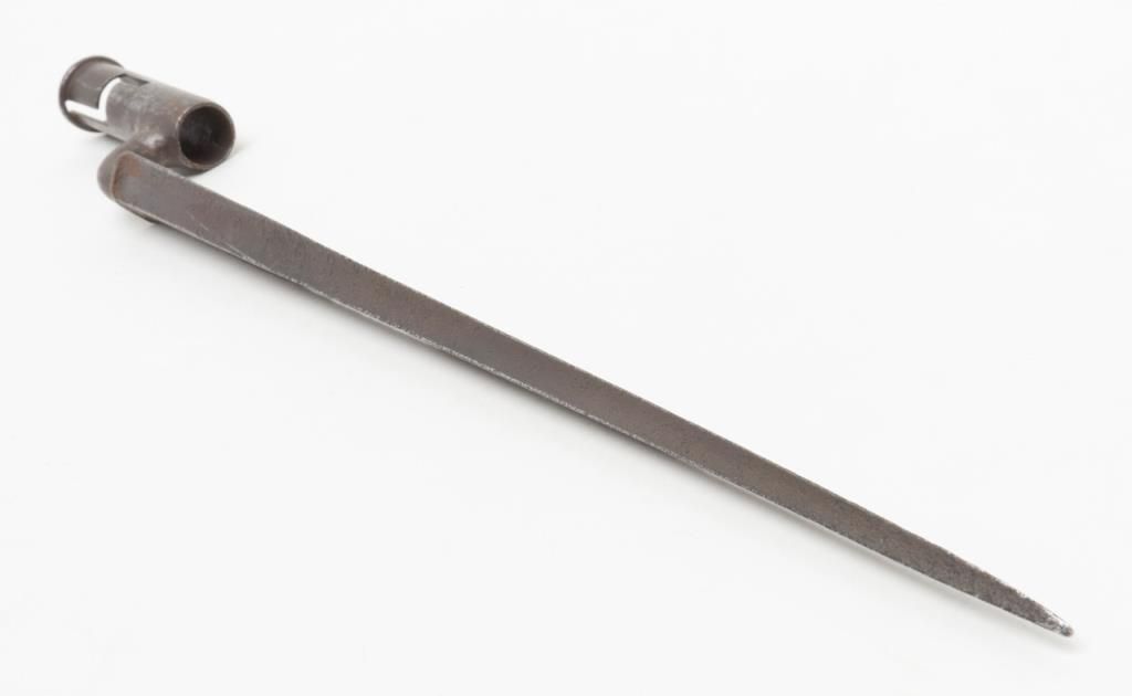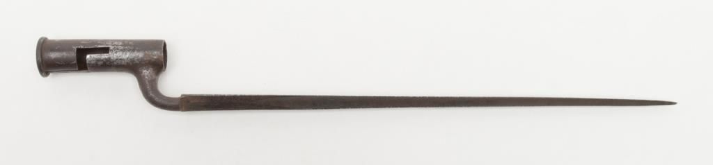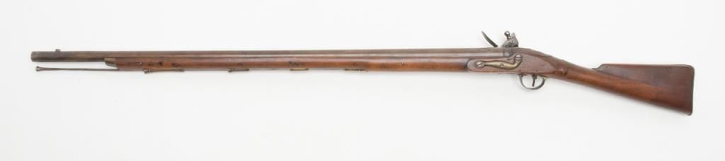 Brown Bess flintlock musket, India pattern, some markings filed, circa 1810-1820, .75 cal., 37-1/2” barrel, wood stock, iron ramrod with triangular socket bayonet; overall good condition with good action, dark bore and good wood stock.(Antique). Est.: $400-$800.