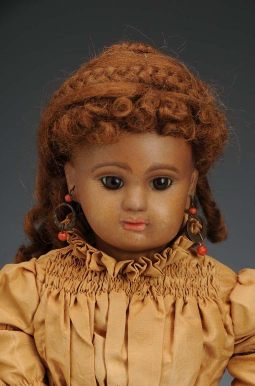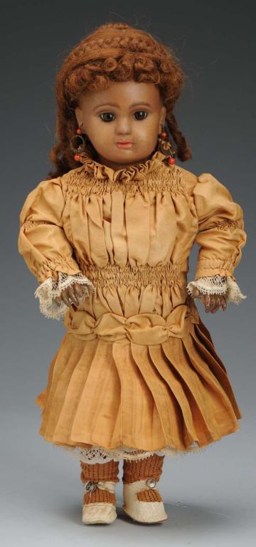 Description Bisque socket head, closed mouth, brown glass paperweight eyes, and incised "Paris Bebe Dep3". Fully-jointed wood and composition body stamped on torso "Paris Bebe Depose" with the Eiffel Tower mark. Over-painted hairline crack on upper right side of forehead, just above the ear. Condition (Good). Size 12" T.