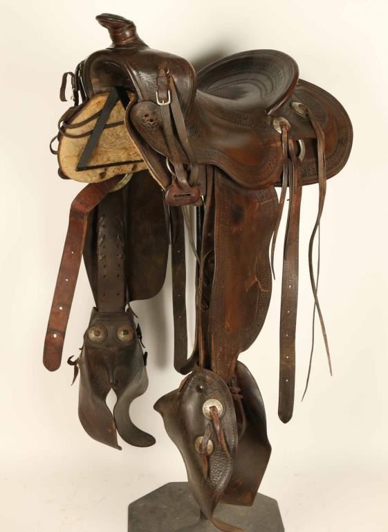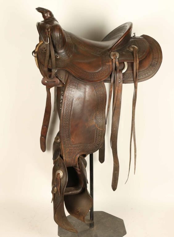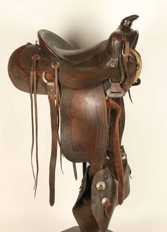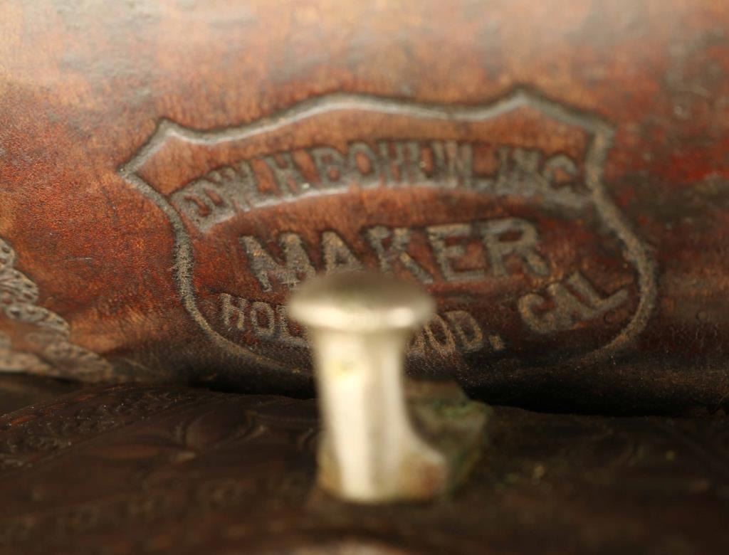 This brown Bohlin saddle is maker marked twice and has a stamped star design. The seat is approximately 13inches long and has large tapaderos, shows age.