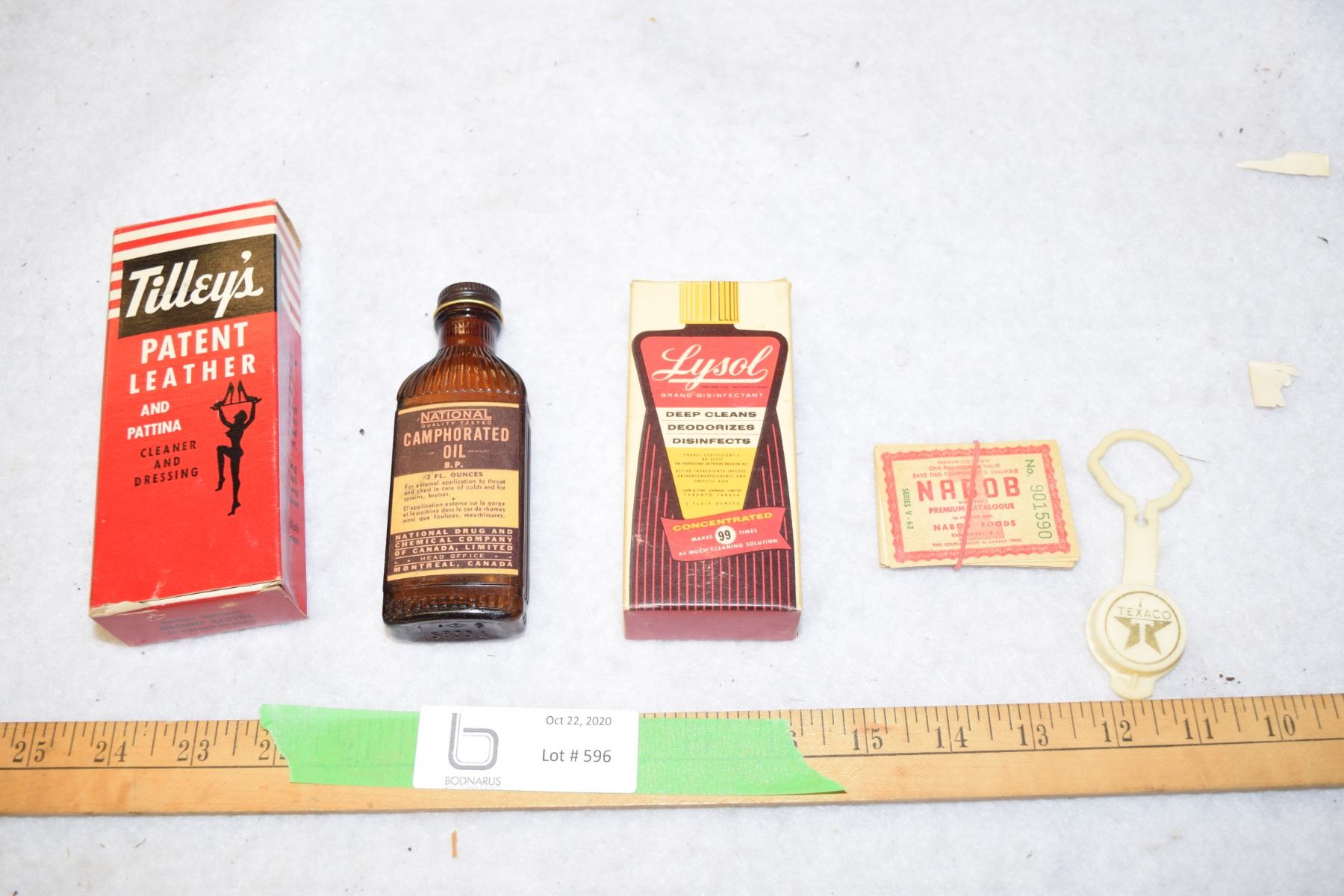 Brown Bottle of Camphorated Oil, Box Lysol Disinfectant, Box of Tilley's Leather Cleaner and More