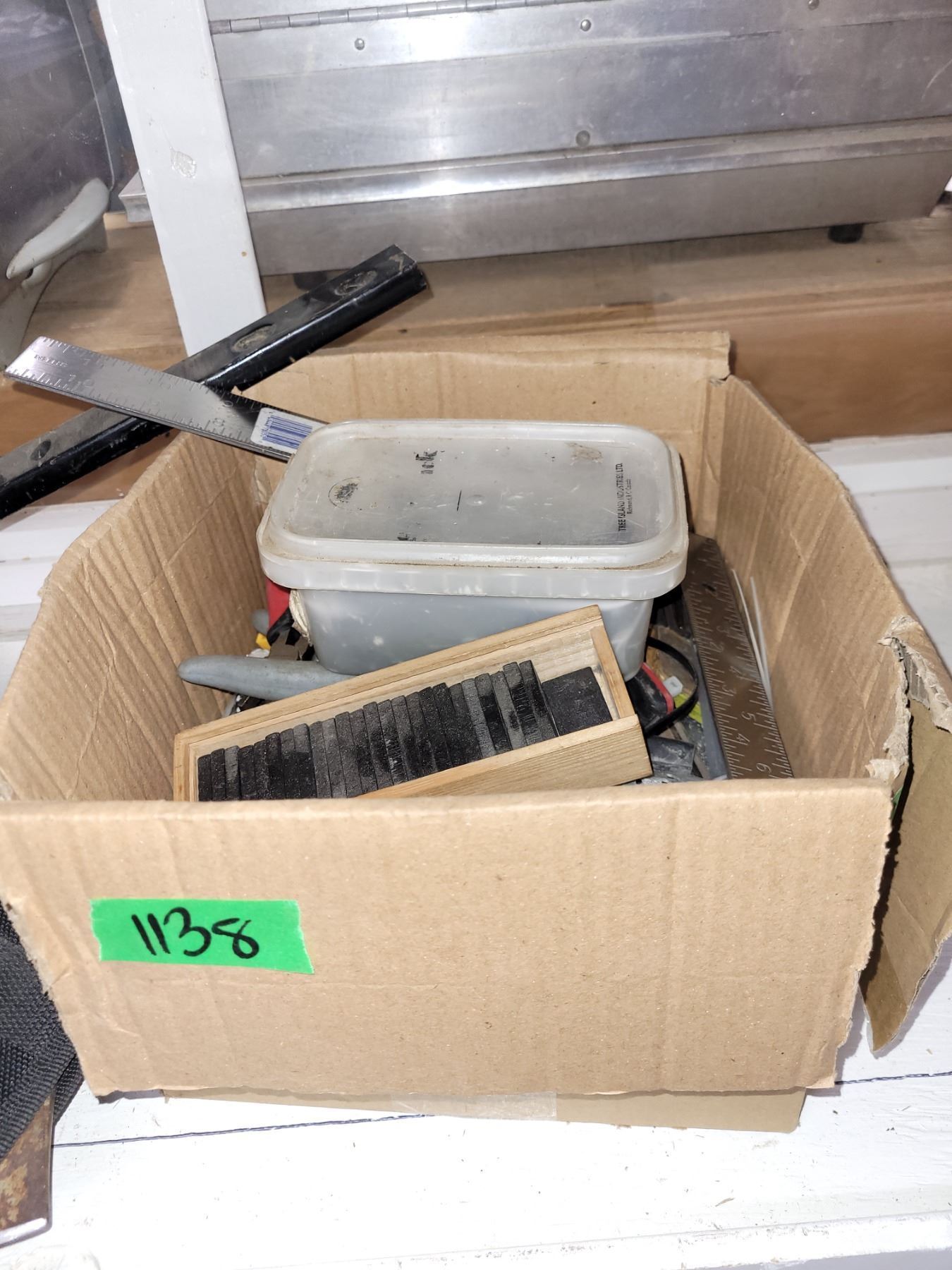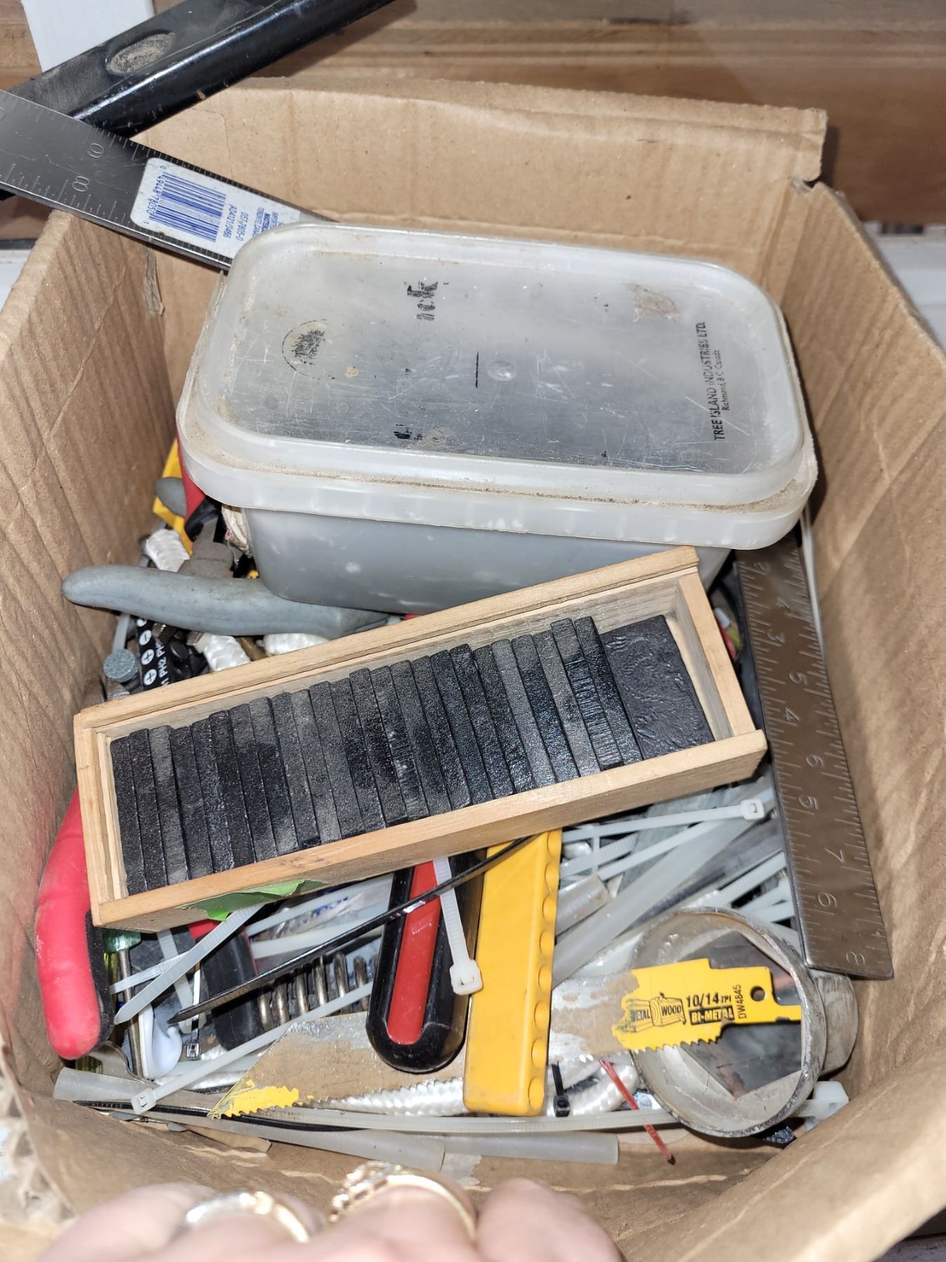 Brown Box with Contents | Metal Ruler | Zip Ties | Bits +