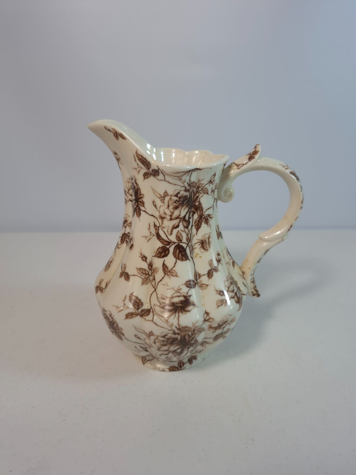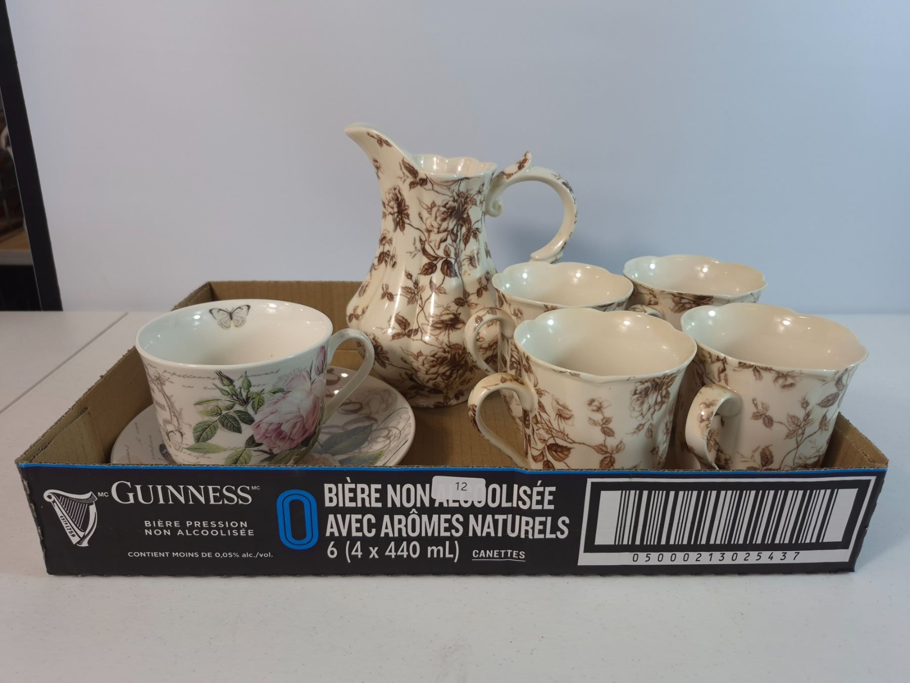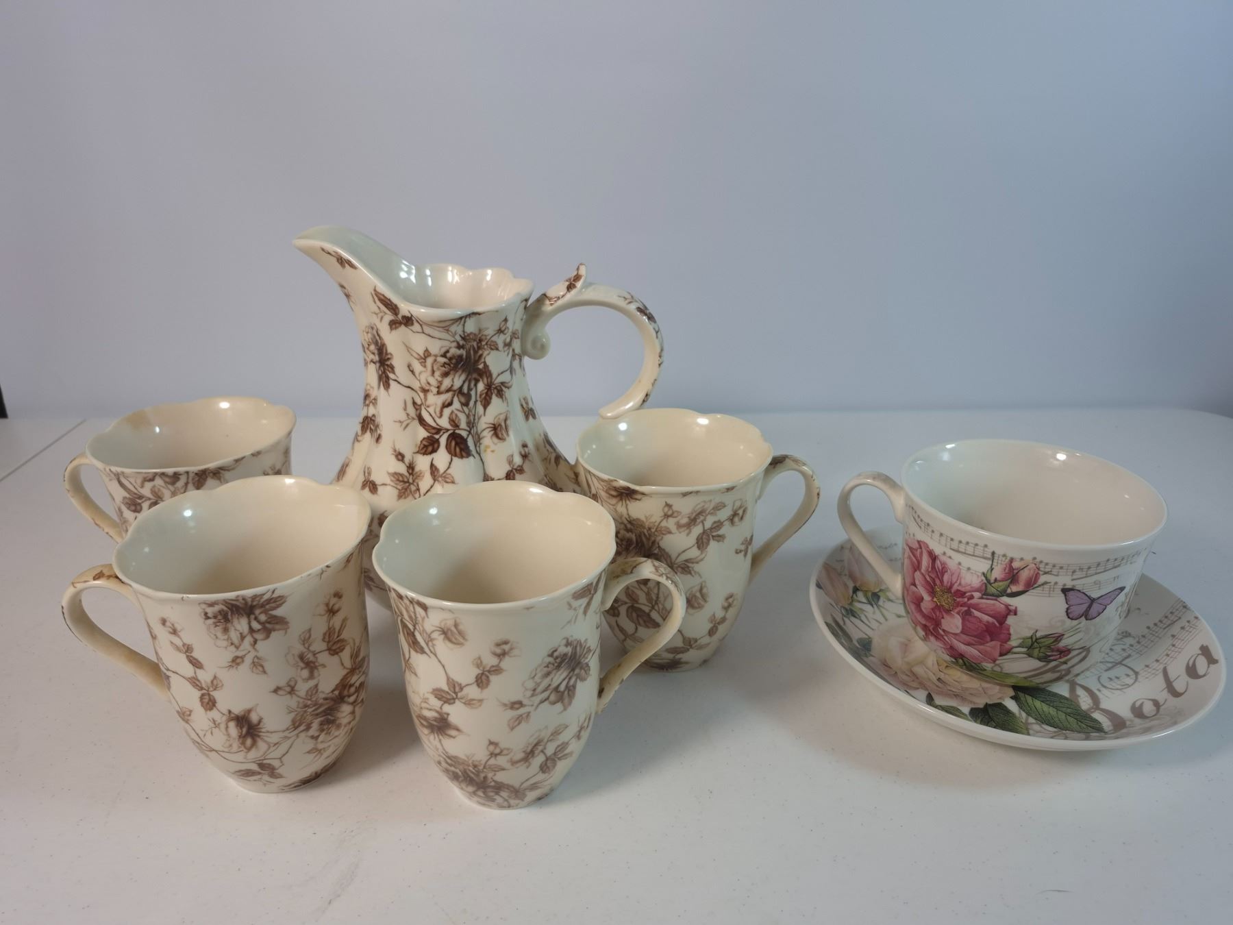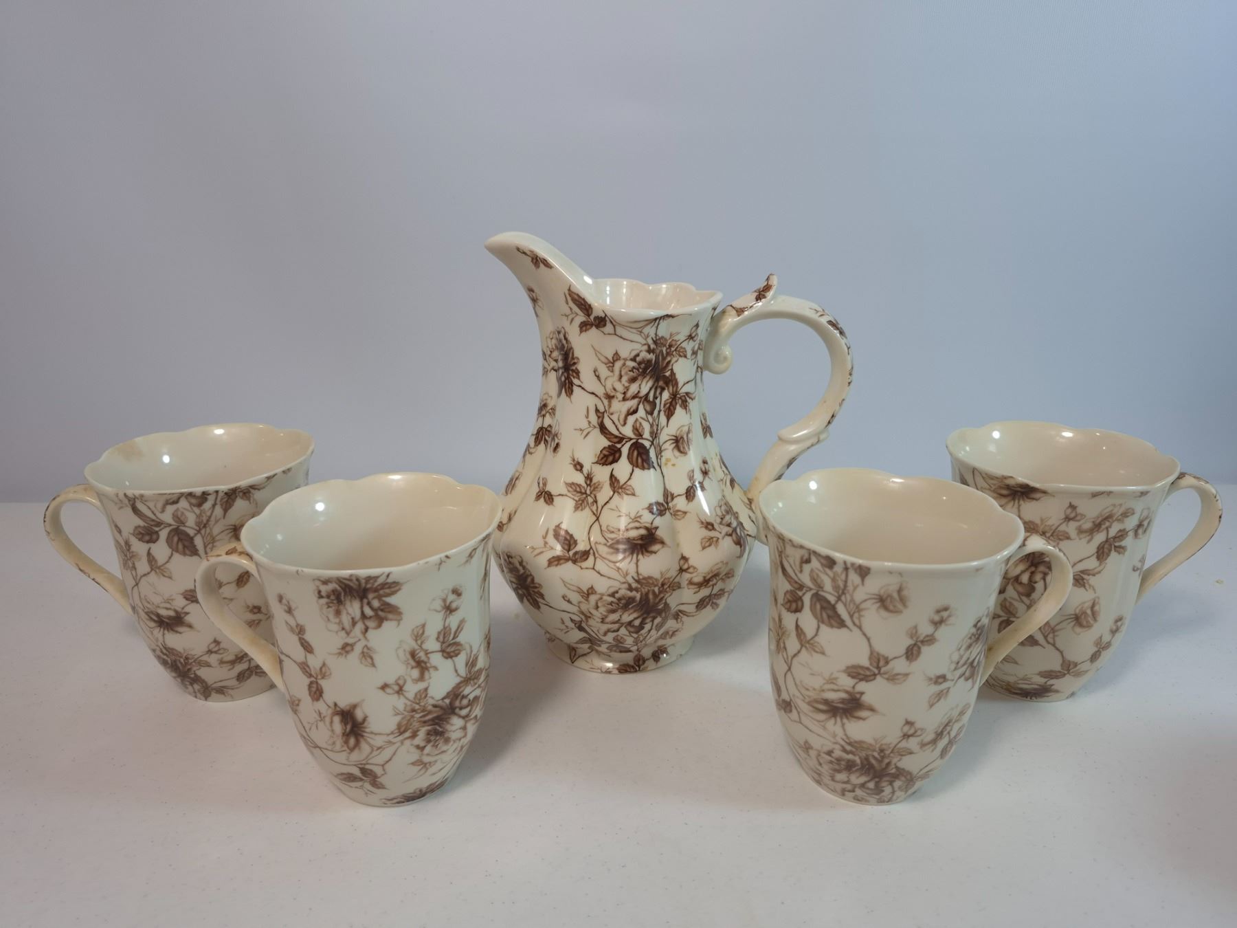 Vintage ceramic pitcher with matching floral cups and saucers, soft cream glaze with brown transfer pattern. Good overall condition.