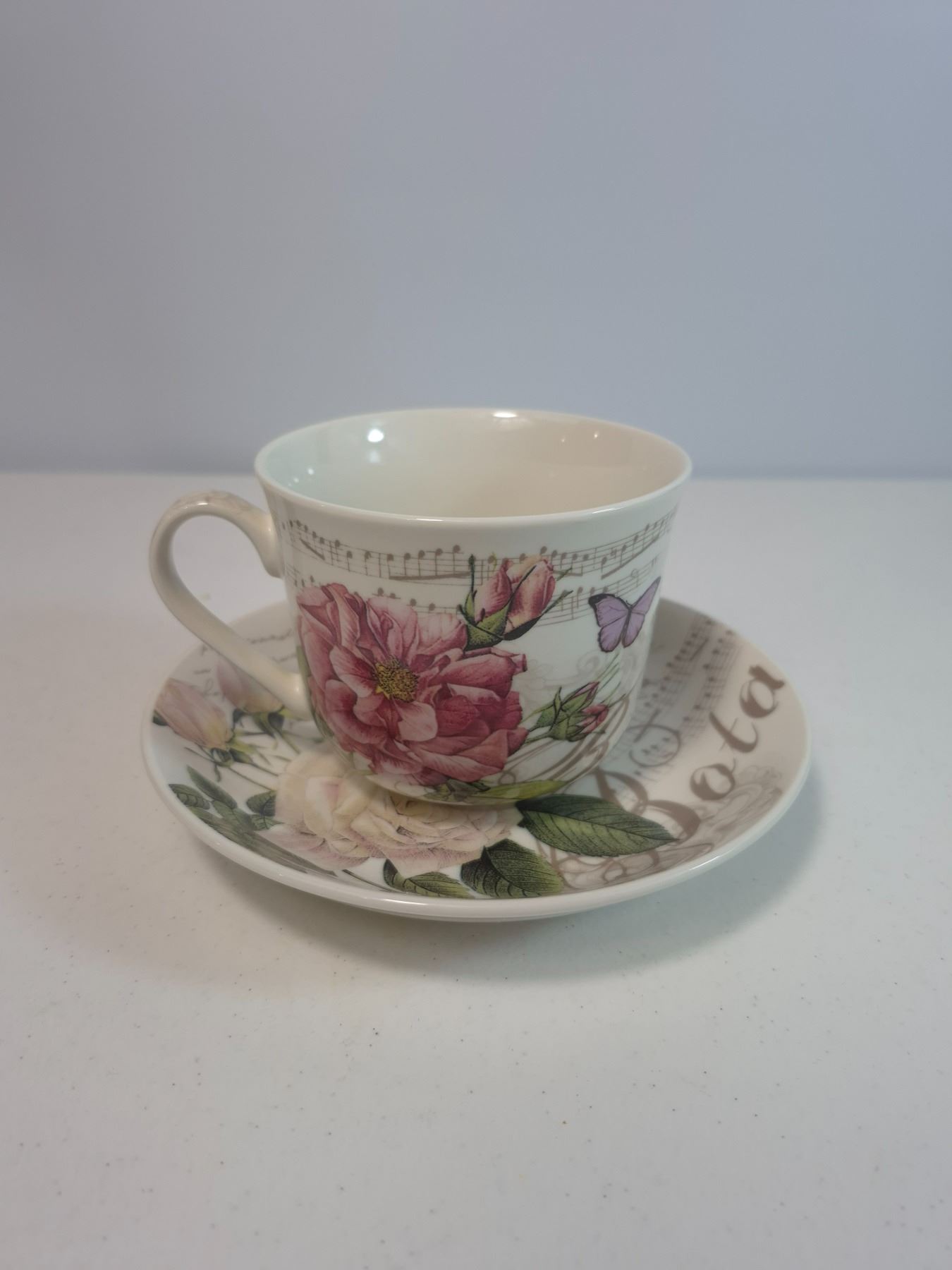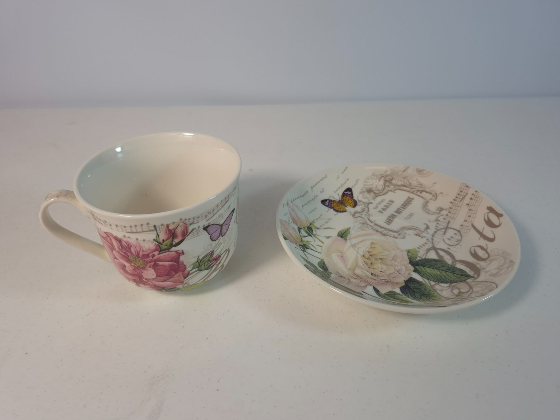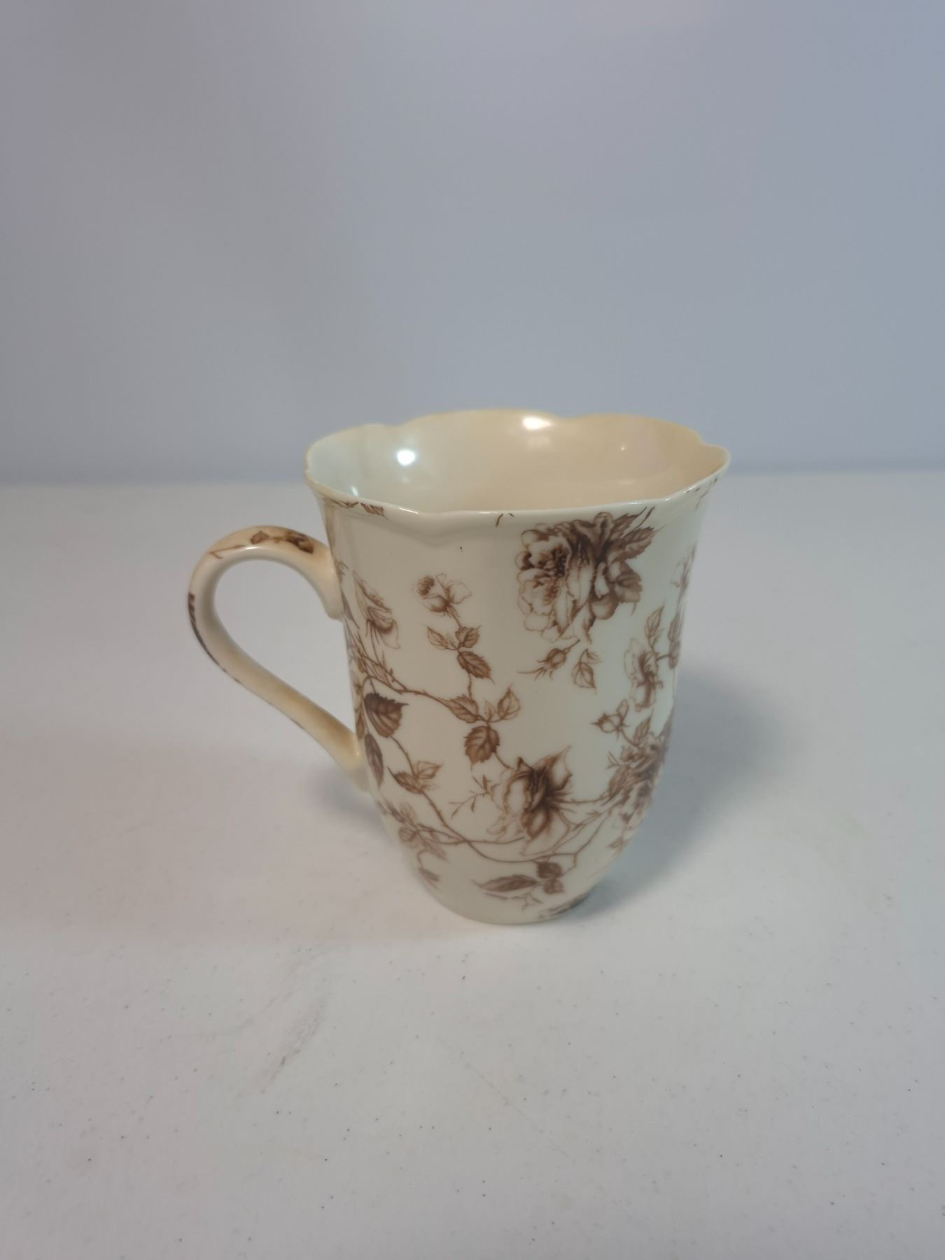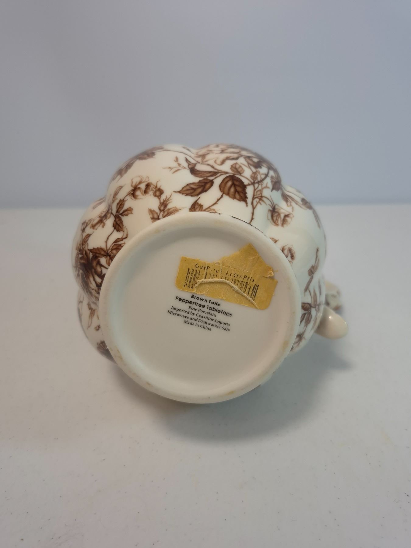 Vintage ceramic pitcher with matching floral cups and saucers, soft cream glaze with brown transfer pattern. Good overall condition.