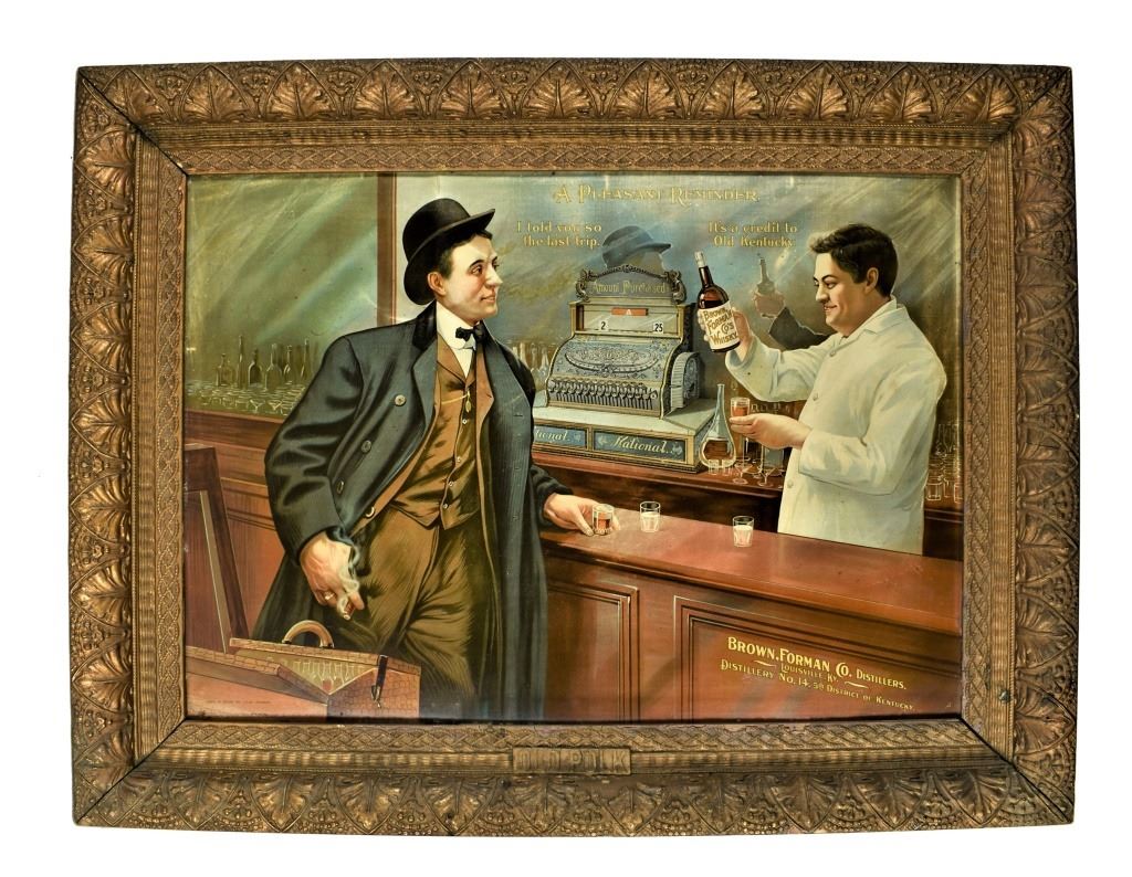 Brown, Forman Co. Whiskey Distillers Tin Sign. Louisville, KY. Entitled "A Pleasant Reminder". Crease on man with derby following around curve of cheek. Minor paint loss and light scratches. Chas. Shonk lithographers, Chicago. The period gesso frame is for OLD POLK, we have not determined if a marriage or a relation with distiller. 33 1/2 X 25 1/2 inches overall.