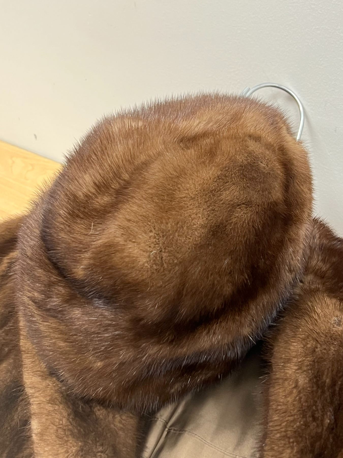Brown Fur Coat with Matching Hat (about: 17" shoulder to shoulder; 42" shoulder to bottom)