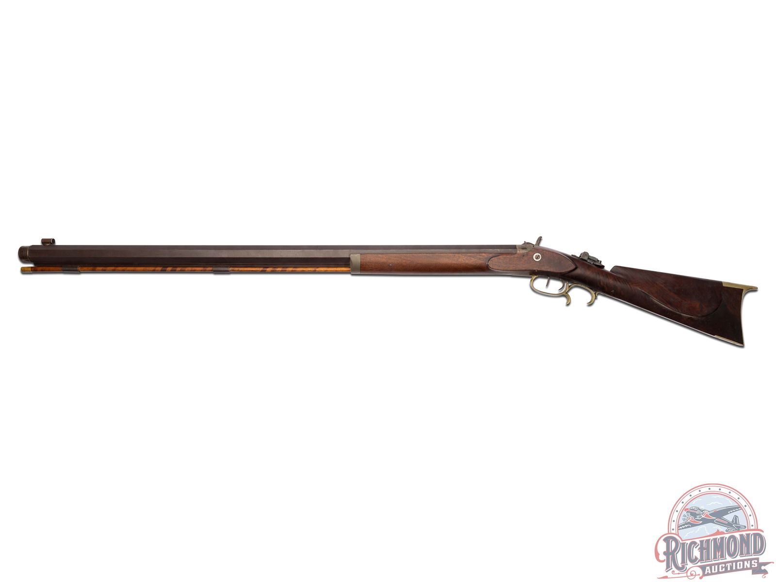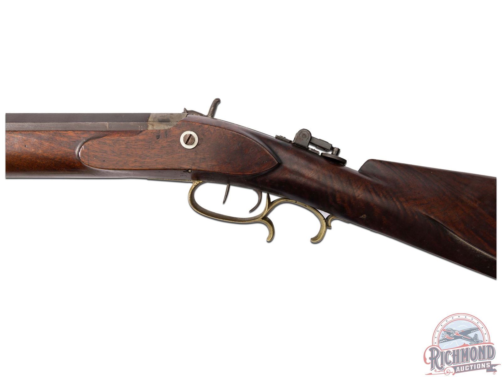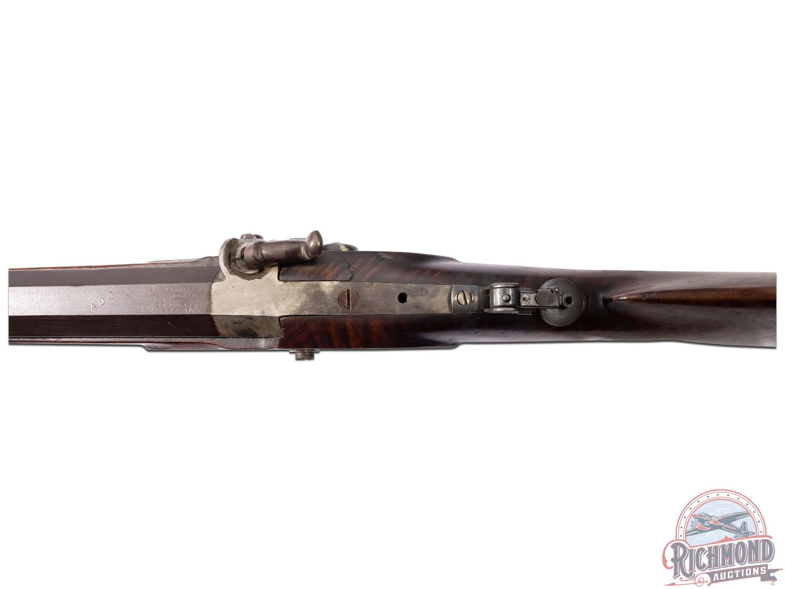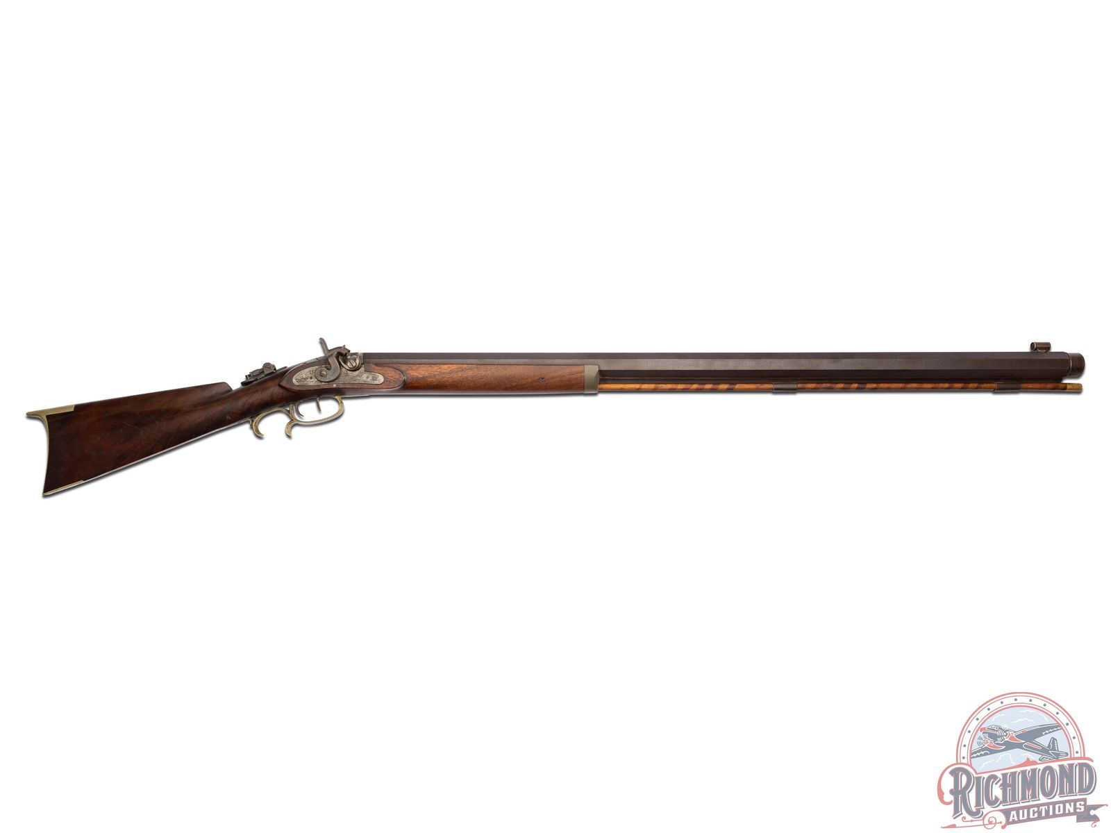 Half-stock percussion heavy target rifle referred to as a "slug" rifle made by Brown & Hirth of Pittsburgh, Pennsylvania, circa 1887. Rifle originally belonged to T.J. Cooper and was used to win the Cup of the Eastern Gun Collector's Association in 1941 and 1942. Rifle is pictured on Page 98 & 99 of Edith Cooper's book "The Kentucky Rifle and Me". Rifle measures 54" overall with a heavy 37-1/2" octagon rifled target barrel in 45 caliber. Barrel is turned for a false muzzle with Globe front sight and a Marble's tang sight. Barrel is marked "Brown & Hirth Pittsburgh, Pa/STANDARD STEEL" with unknown initials "ADC.". Commercial percussion lock with double set trigger control. Walnut half-stock with cheekpiece and German silver hardware. Rifle comes with original striped hardwood rod and original "Pickett" style bullet mold and swaging tool. J.T. Livengood Collection. CALIBER: 45. FFL STATUS: Antique.