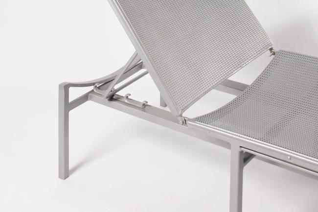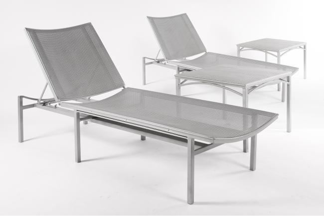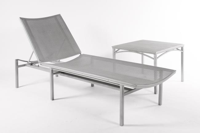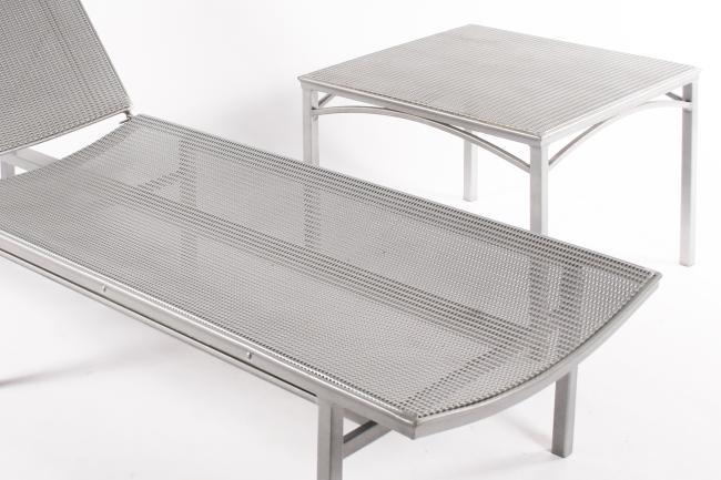 14h x 73w x 23.5 inches sunbed, 17.5h x 23.5w x 23.5d inches table, silver painted metal, perfect