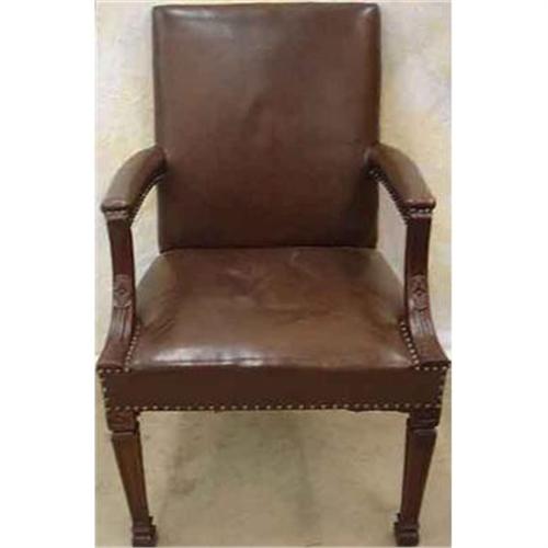 Brown leather open armchair with acanthus carving on the arms