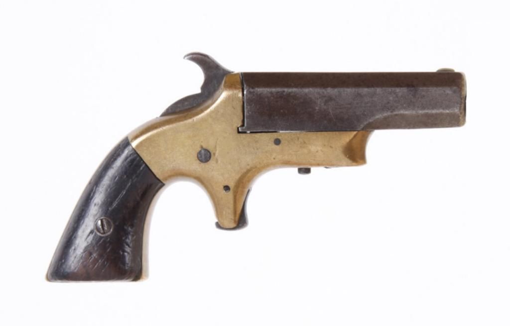 Brown Mfg Co Mdl Southerner Cal .41 SN:257Derringer with 2.5" octagon barrel that pivots sideways for loading, extractor mounted under barrel at breech, brass frame with wood grips, fair markings and action. Condition: In overall good condition.