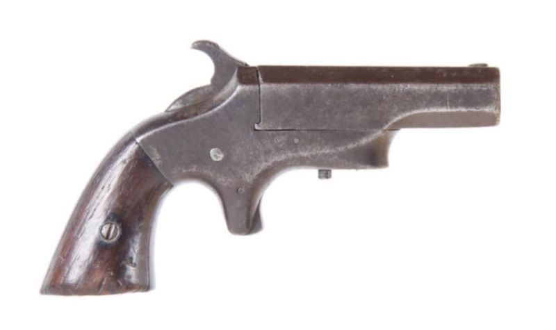 Brown Mfg Co Mdl Southerner Cal .41 SN:9658Derringer with 2.5" octagon barrel that pivots sideways for loading, extractor mounted under barrel at breech, iron frame with wood grips, fair markings and action. Condition: Fair to good