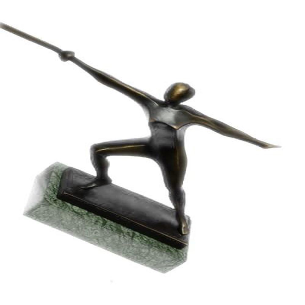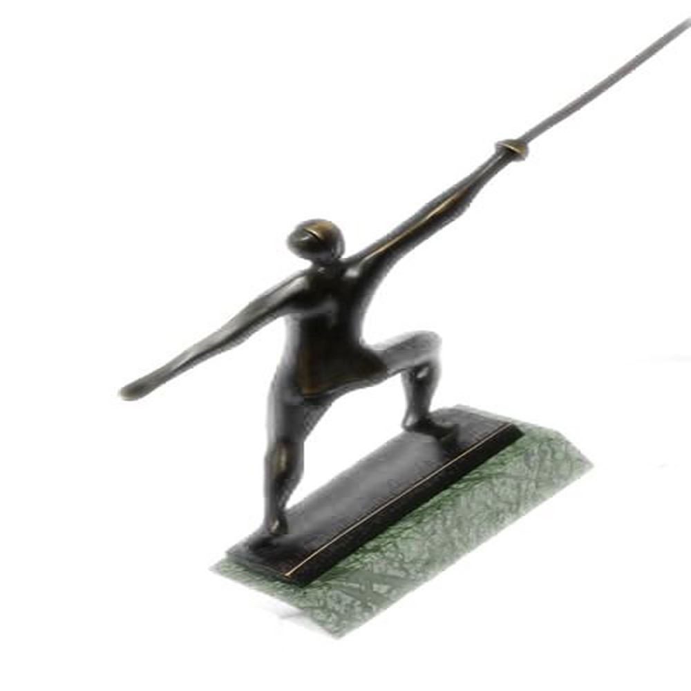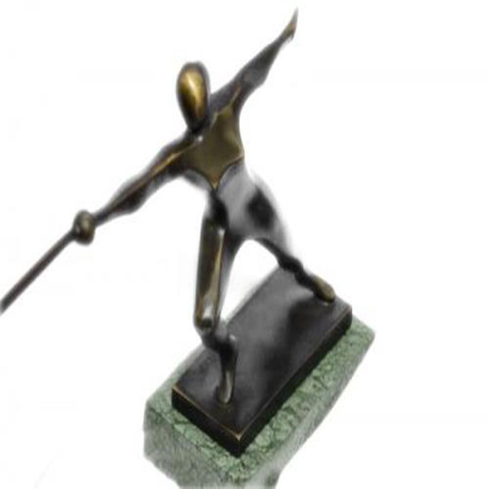 This Sculpture shows a fencer who is very focused to achieve his victory over his opponent. The fencer stands with his facing forward, a strong attacking move. This Sculpture was crafted using the lost wax method and it stands on a marble base. Bronze Dimensions with Marble Base: Height 8 X Width 13 inches. Weight: 5 LBS.