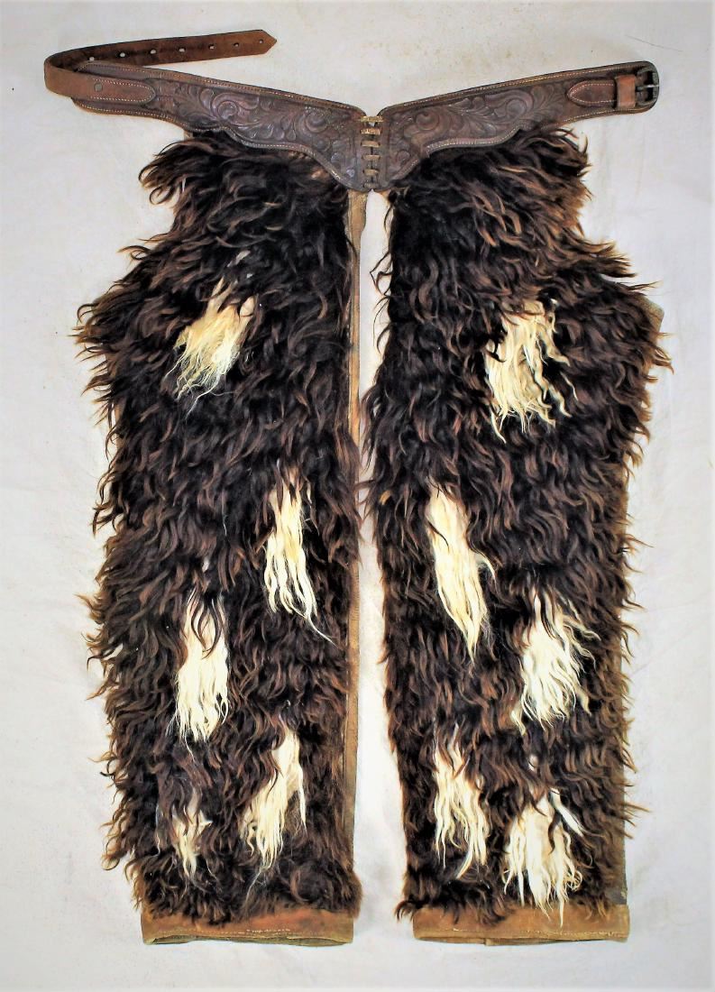 Super scarce early basket stamped straight belted step-in chaps with rich brown hair and white pinto spots.