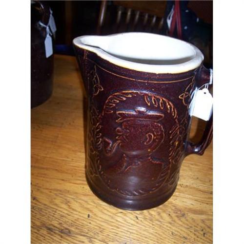 Very good brown stoneware pitcher.On one side it has a man with a pipe and on the other side is a Dutch windmill.Has a heart shaped mark on the base with I think some writing,that I can not read.Great condition and stands a large 8 1/2" tall.