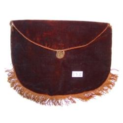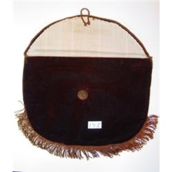 9.5" long (with fringe 10"), Brown Velveteen envelope pouch with fringe. Ca. 1920, hand sewn beige cloth lining flap, has piping w/loop that closes over thread decorated button. Good cond