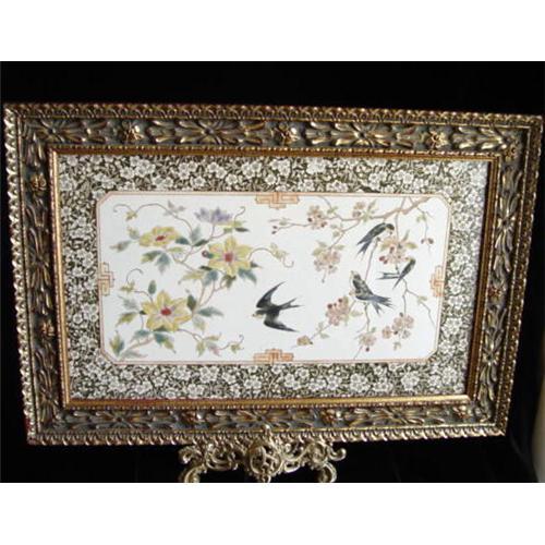Brown Westhead & Moore 1870 Asthetic Movement Plaque. It is in the chinoiserie style of recangular form enriched with swallows flying among prunus blossom set within a printed green border. The plaque is framed in an ornate gilt frame. The back is numbered 2105. For further information or pictures please email me.