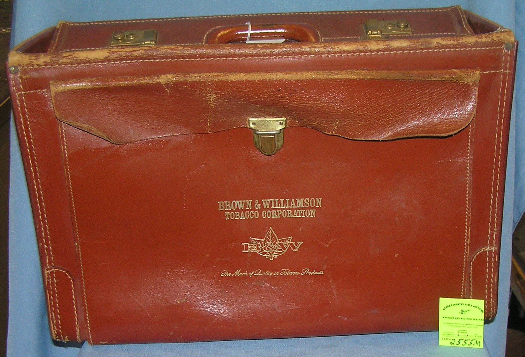 High quality leather Brown and Williamson Tobacco products salesman sample carry case 20" wide 10" deep 13" high with brass latches circa 1940's 50's est. value $400.00-$500.00