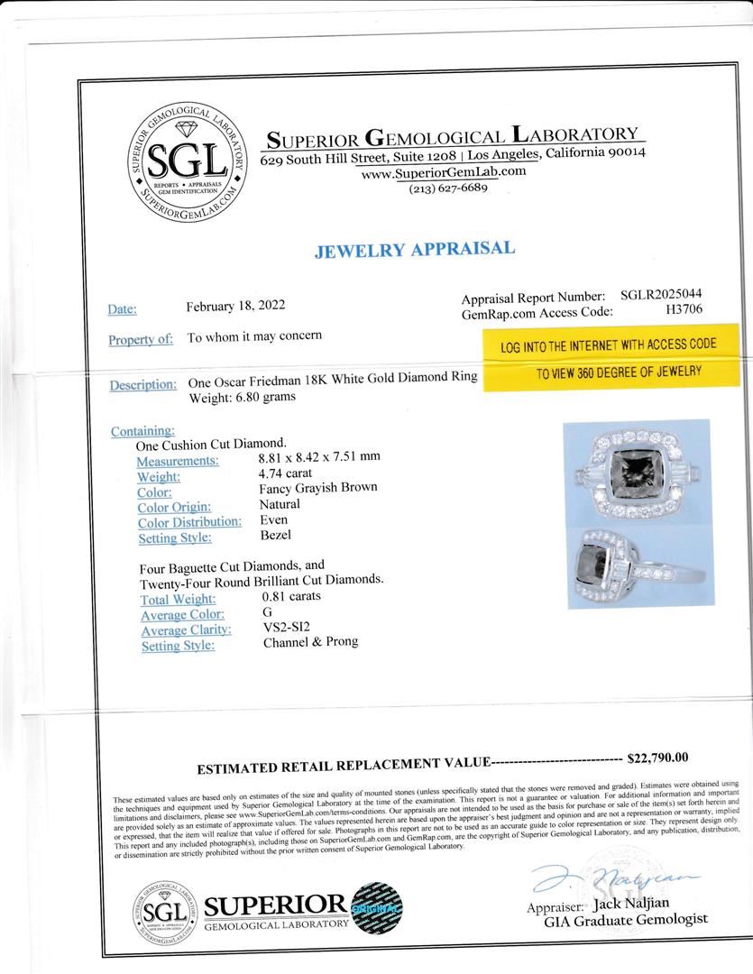 Brown diamond ring. Please see Photos and Description for all available information. This cushion-cut fancy intense brown diamond ring is the perfect symbol of your commitment to love. The ring is set with a 4.74ct brown fancy intense diamond at its center, surrounded by stunning round diamonds and finished with high polished edges.The ring is made of 14K white gold and is a perfect piece of jewelry to make your love last forever.