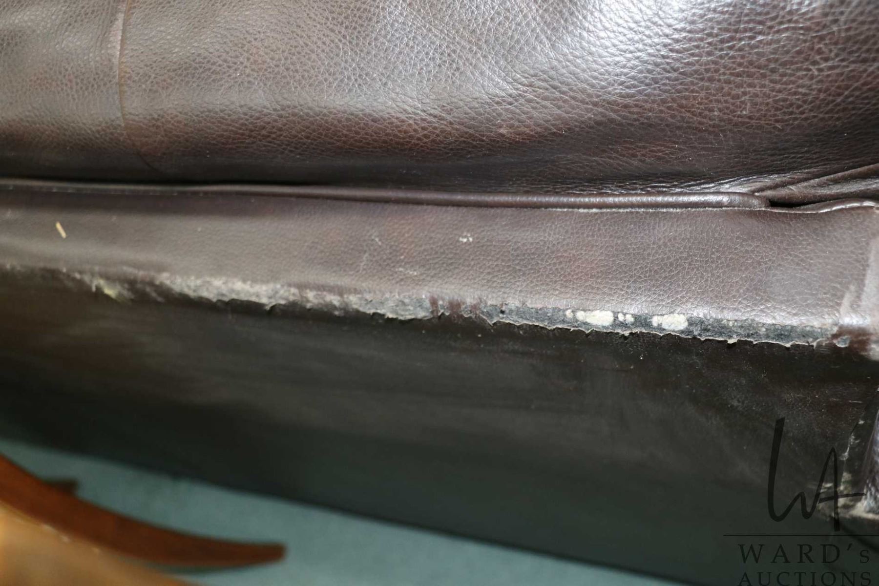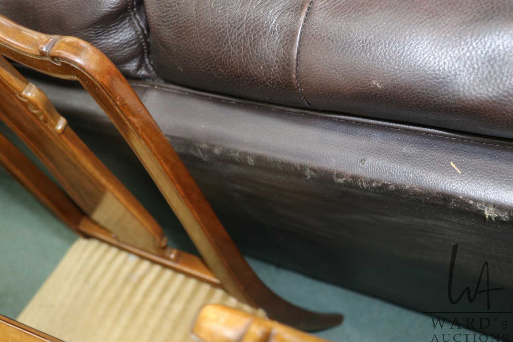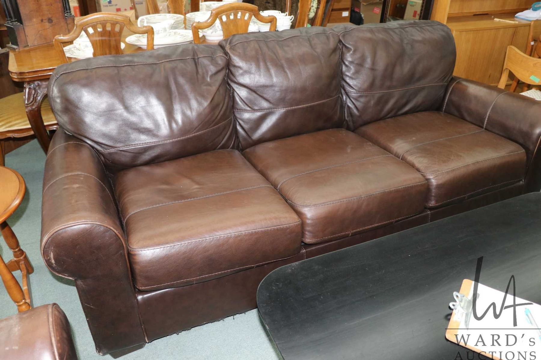 Brown leather full sized sofa with some distressing on the back, 94" long