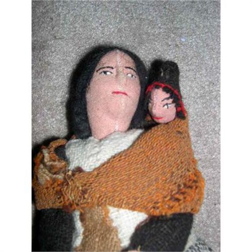 Here is a wonderful example of a Mother and her baby. This lady stands 20" and has her baby on her back secured with a shawl. Her legs do not move but her arms have a wire in them and move. The hair feels like mohair and is in braids. The features are stitched with thread. The fingers have a black line between them. She is very well made. I would guess she is from Peru or a South American Country. She has no odor or tears, or stains. She is from a smoke free environment. If you can love her, please bid. Thanks for viewing.