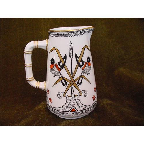 This is a striking 19th century English small pitcher by Brownfield & Sons. It is 3 5/8" high and is white with hand painted black, gold and orange birds and cattails. The pitcher was made for a Philadelphia company. It is in very good condition. Circa 1875.