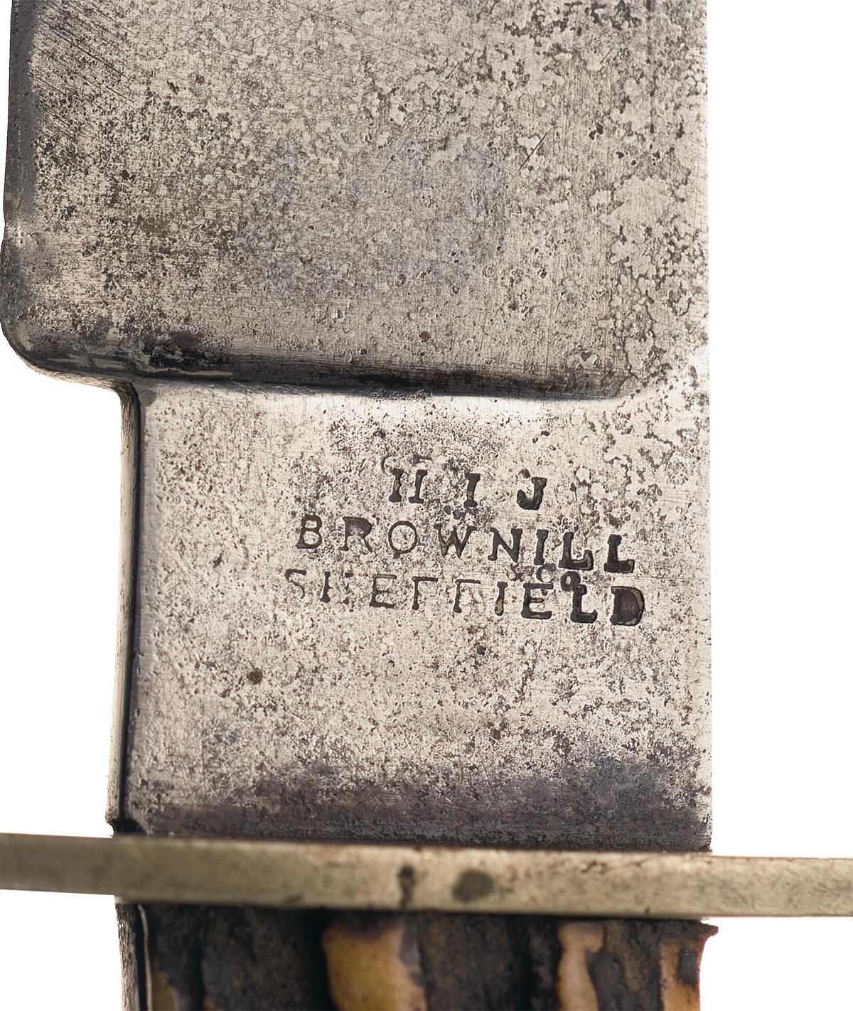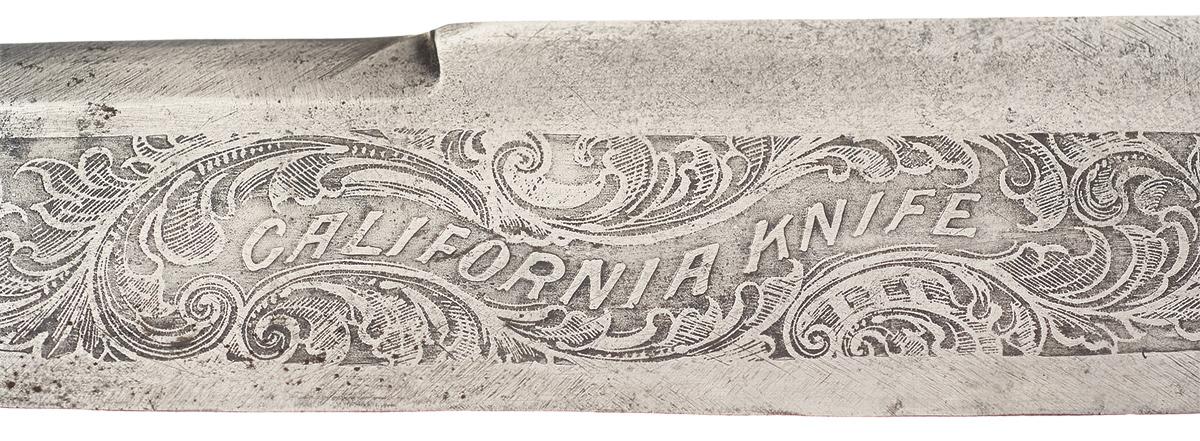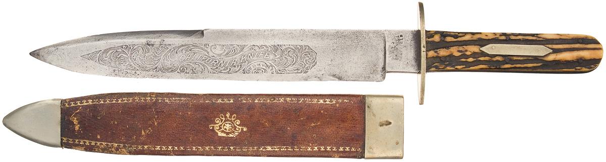 Manufactured by Brownhill of Sheffield, England. The blade is 9" and marked "H I J / BROWNHILL / SHEFFIELD". The blade is also etched with a scroll pattern surrounding "CALIFORNIA KNIFE" on the left side. Sheffield cutlery firms responded to the California Gold Rush by unleashing bowie knives etched with gold rush themes such as this example. Silver diamond shaped guard. Fitted with stag scales secured with six rivets and a silver plate on the left scale. OAL: 13". Complete with a leather sheath with gold accents and a silver tip and throat with carrying stud.