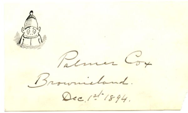 Palmer Cox; the creator of the famed Brownies signed and dated 1894 card with her creature on it! This item comes with a certificate of authenticity guaranteed for the life of the piece.