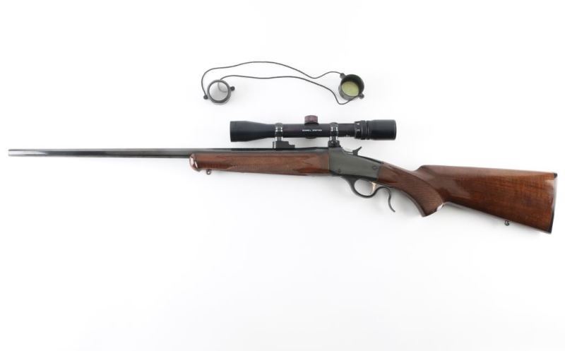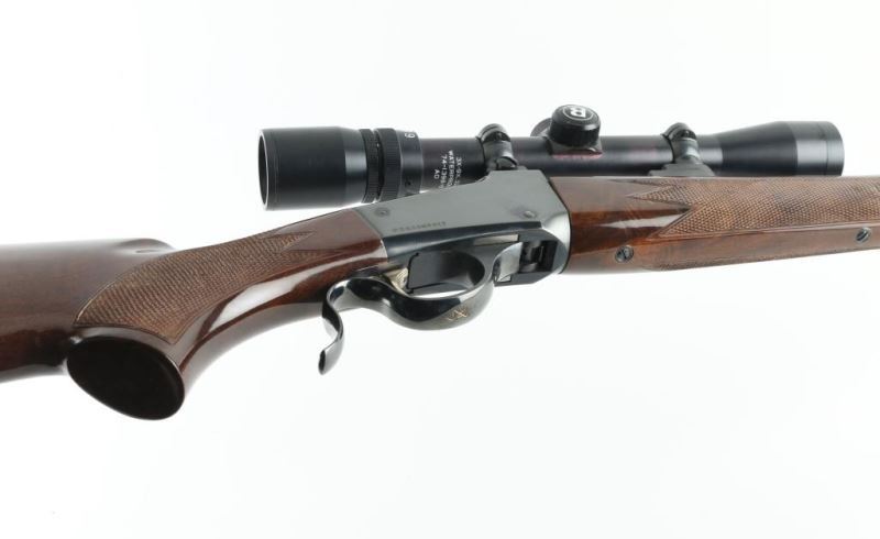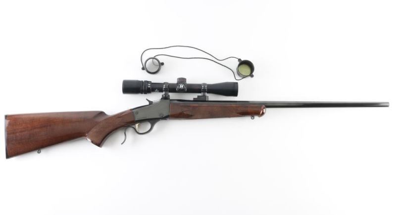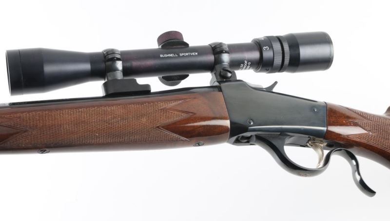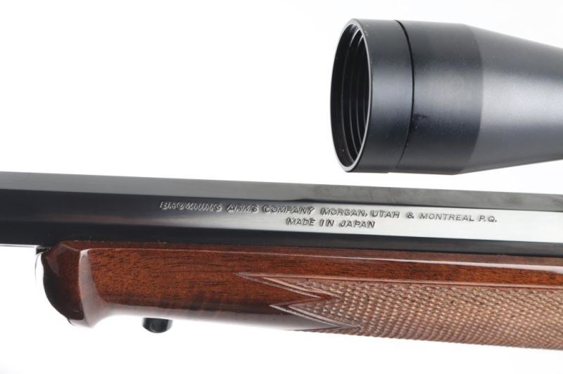 Japanese falling block rifle imported by Browning Arms, Morgan UT. Features blued finish, urethane finished fancy figured walnut stock & forend, schnabel forend tip, checkered panels at wrist & forend, sling studs, 24" octagonal barrel, no sights, two piece Leupold style scope bases, exposed hammer. Bore looks good but needs cleaned. Overall condition is like new with few signs of handling. Mounts a Bushnell Sportview 3-9x32 scope. Finish looks good except for scuffed spot on barrel about 4" from muzzle. Condition: NRA Very Good