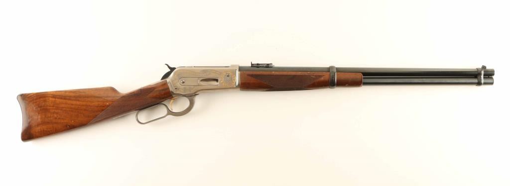 'National Forests Centennial, SRC' Embellished reproduction of the Winchester 1886 lever action repeating rifle chambered in .45-70 Government, manufactured in Japan by Miroku circa 1990's. This commemorative rifle celebrates 100 years of the U.S. Forest Service 1891-1991 and was part of a limited edition run with only 2,000 produced. It features a blued 22" round barrel, full-length tube magazine, pinned blade front sight, flip-up ladder rear sight graduated to 2,000 yards, coin finished receiver with engraved & gold plated embellishments regarding the Forest Service, smooth gold trigger, serrated hammer spur, saddle ring, checkered select walnut forend with high gloss finish and straight grip shoulder stock with metal carbine buttplate. Rifle exhibits approximately 95% of it's original finish showing scattered handling marks/scratches and a few spots of pitting observed on the upper tang and on the left side of the receiver behind the saddle ring. Action is smooth, the bore is excellent and the wood stocks are good to very good with blemishes. Condition is near NRA Very Good. ***Modern Firearm***