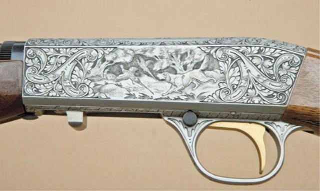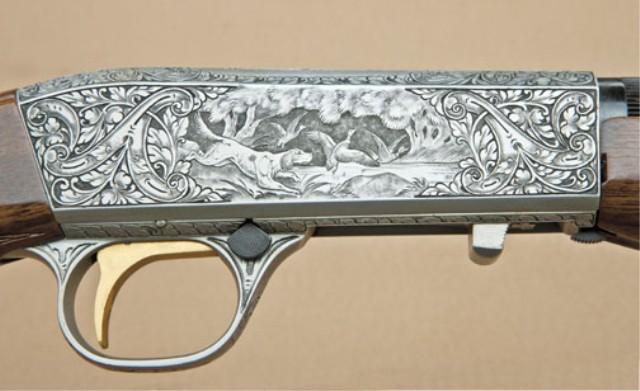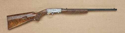 Browning .22 caliber semi-automatic rifle, Belgian made Grade III, serial #3T77814. The rifle shows a high quality engraved receiver with portrait of dog chasing birds on left side, dog with bird on top, and dog chasing birds on right. The engrav is signed “R. Risack”. The stock is deluxe checkered French-style walnut with a flaming grain and fancy checkering. The barrel retains 98-99% blue, just some slight toning. The frame is excellent with just some slight oil that will clean. The stock is fine to excellent, the interior shows just some slight use. 98-99% overall. From the Robert Petersen Collection. Est: $1,250 - $2,500