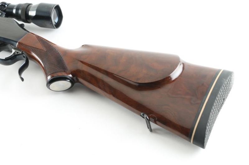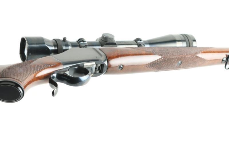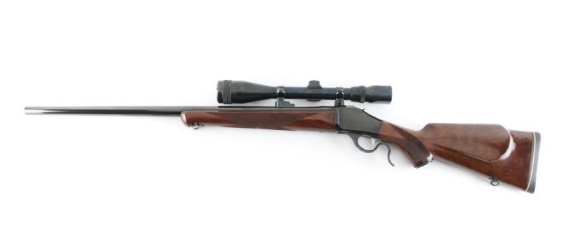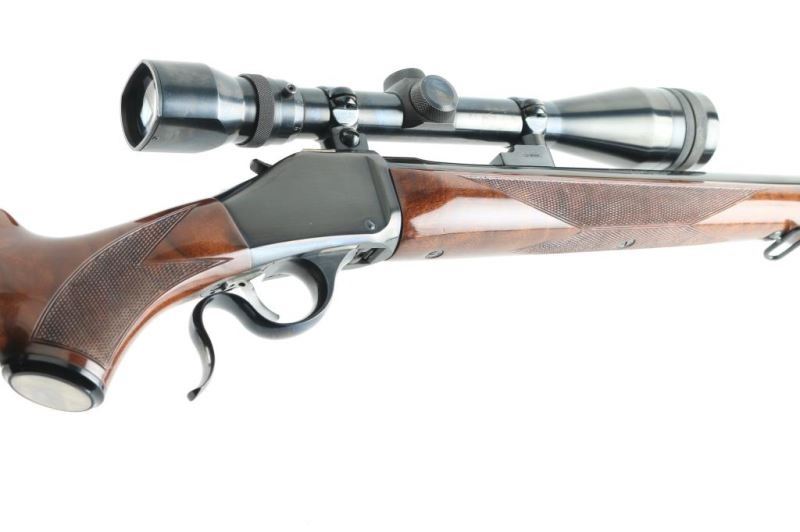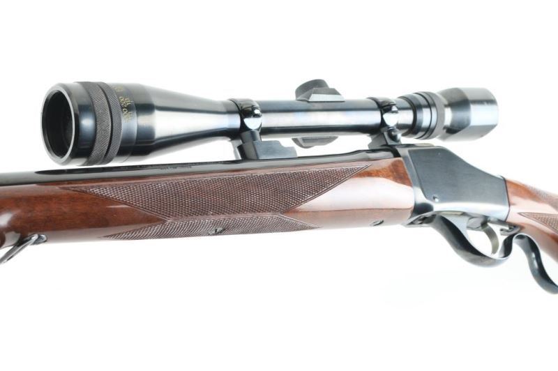 Japanese made single shot rifle imported by Browning Arms, Morgan UT. Lever action falling block action. Features walnut stock & handguard with urethane finish, curved wrist, right handed cheek piece, solid rubber butt pad, blued finish, 26" medium profile round barrel, no sights, 2 piece Browning scope mounts, sling swivels, checkered panels at wrist & forend. Bore is very good condition. Retains 90% finish with handling marks. Wood is excellent. Mounts a very good condition Weaver V9-W 3-9x scope with wide "TV View". Condition is NRA Very Good++ *** Modern Firearm ***