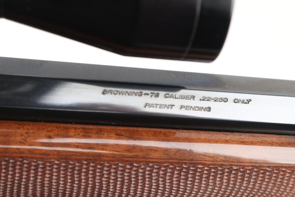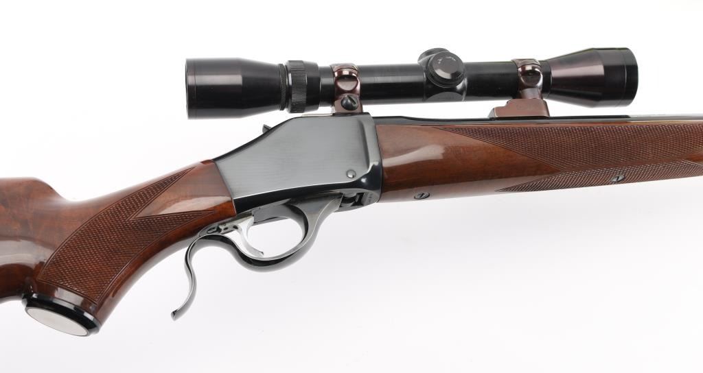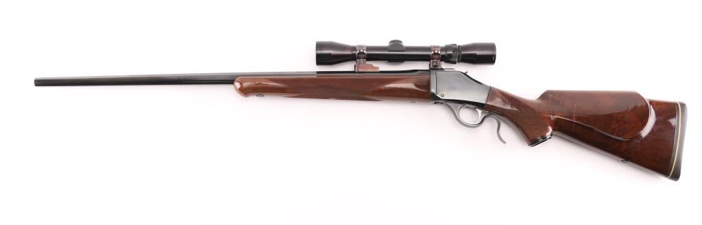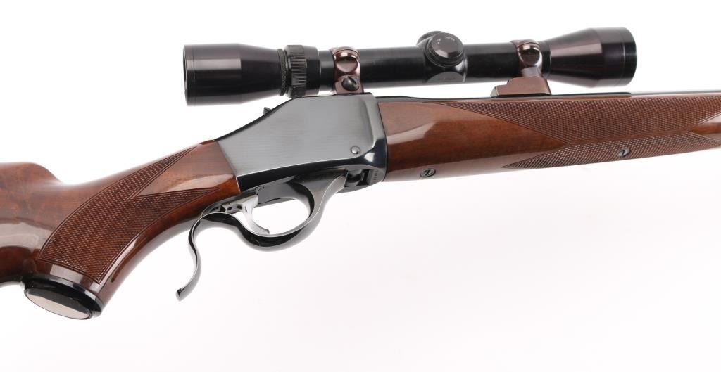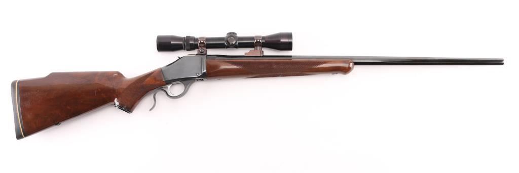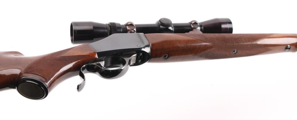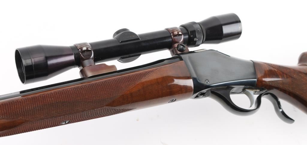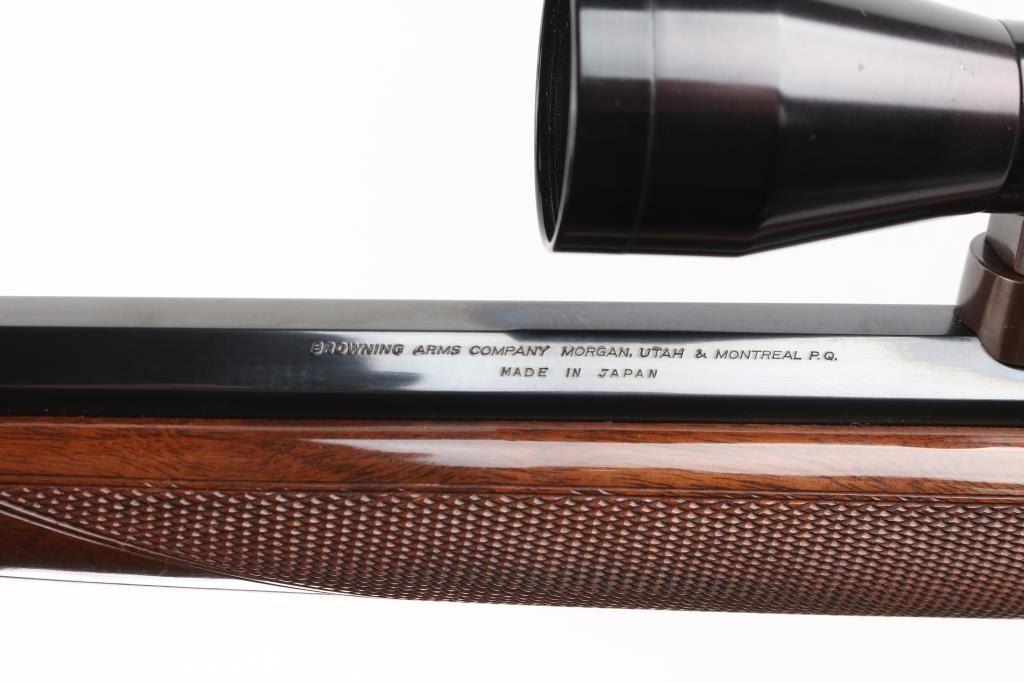 Japanese made single shot rifle imported by Browning Arms, Morgan UT, circa 1973. Lever action falling block action. Features walnut stock & handguard with urethane finish, curved wrist, right handed cheek piece, solid rubber butt pad, blued finish, 26" medium profile octagon barrel, no sights, 2 piece Browning scope mounts, slot type sling swivels, checkered panels at wrist & forend. Bore is very good condition. Retains 95% finish with handling marks, area of thinning finish on barrel, other minor blemishes. Wood is excellent. Mounts a very good condition Browning 2-7x scope with fine crosshairs, clear view, some scrapes to outside finish. Condition is near NRA Excellent *** C&R Firearm ***