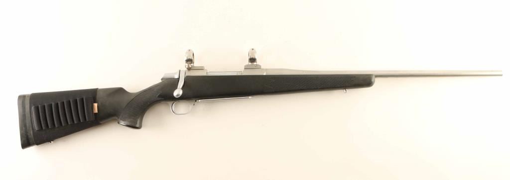 'Stainless Stalker' Stainless steel bolt action sporting rifle chambered in .30-06 Springfield, manufactured in Japan by Miroku circa 1988. Features a satin finish, tapered 22" barrel without provisions for sights, installed Buehler two-piece scope base with rings, adjustable trigger, sliding tang safety, fluted bolt with cocked indicator on the rear, hinged floorplate with detachable magazine, swivel studs and checkered black synthetic semi-pistol grip shoulder stock with factory recoil pad & slip-on cartridge carrier. Rifle exhibits light to moderate wear with scattered scuffs and scratches. Action is smooth, the bore is excellent, and the synthetic stock is good with wear. Condition is NRA Very Good. ***Modern Firearm***