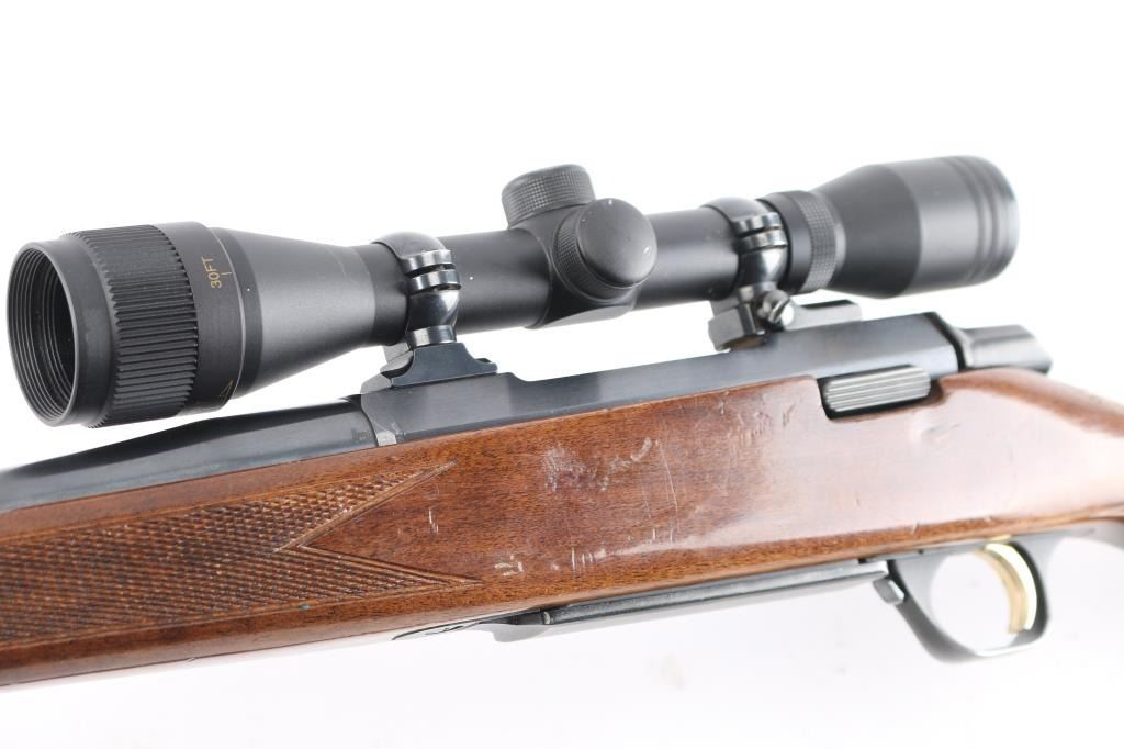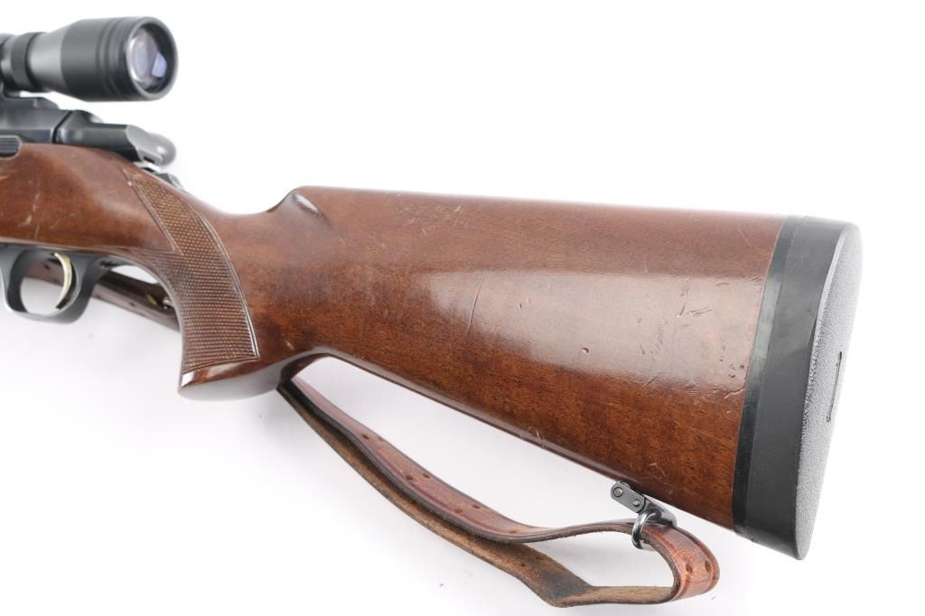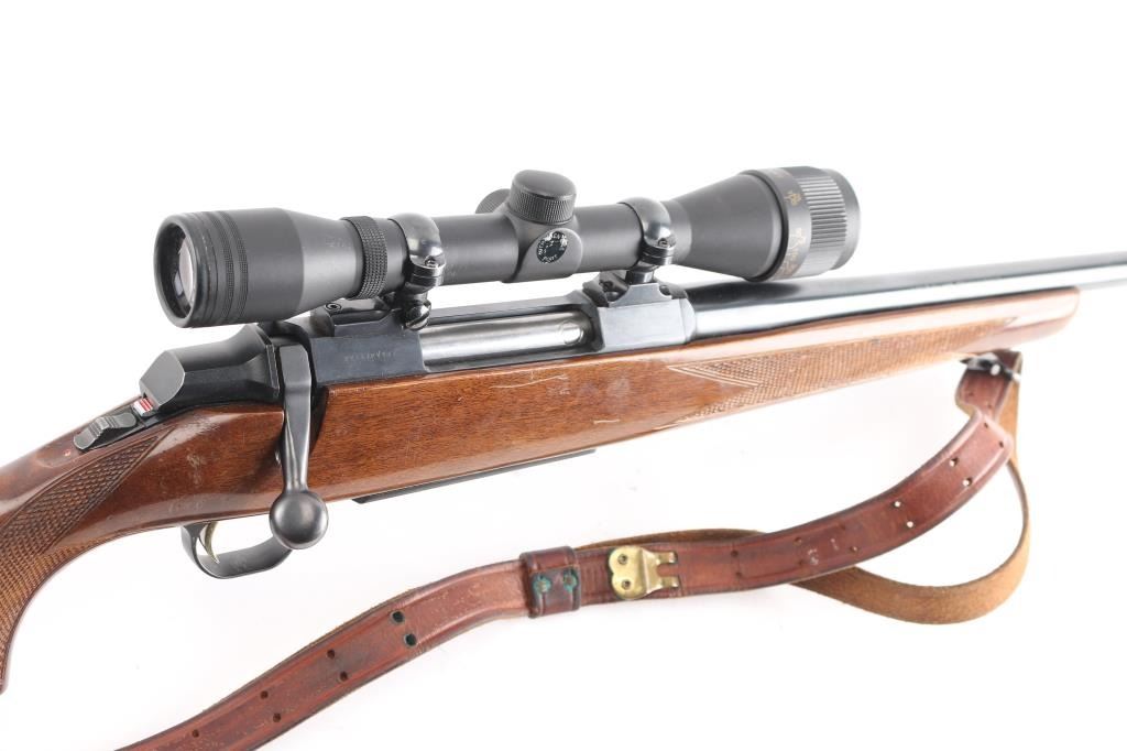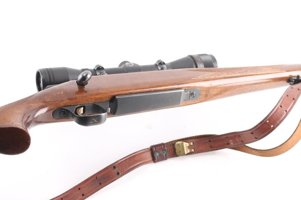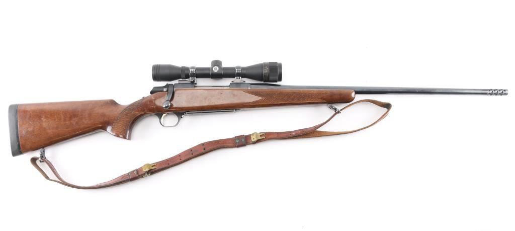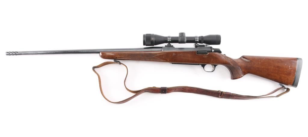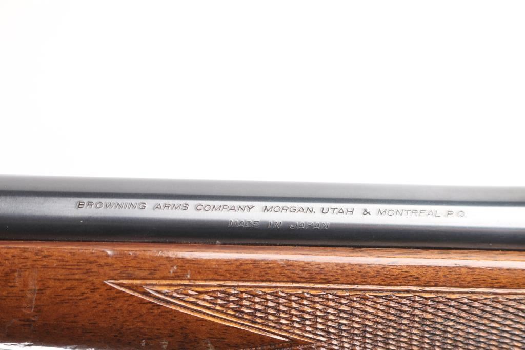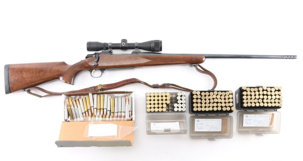 SN: 22187PV717. "Medallion Grade" bolt action center fire rifle manufactured in Japan by Miroku for Browning circa 1985, first year of production. Features blued finish, urethane finished walnut stock , curved wrist, gold toned serrated trigger, checkering at wrist & forend, black rubber recoil pad, 25" barrel including ported muzzle break, no provisions for sights, tilted bolt handle with flattened knob, stainless bolt, hinged floorplate with detachable magazine, sliding tang safety, grooved dovetail along receiver top, bolt release on left receiver, cocking indicator. Mounted with a unmarked nitrogen gas scope with crosshair reticle, clear optics. Bore is excellent/bright. Wood is overall good/sound with many minor scratches/dings, action is smooth, blue is about 97% with minor edge wear, a couple of minor scratches on the barrel. Also included with the rifle is a box containing 38 rounds of Nosler 200 gr, e-tips .338 Win. Mag. ,50 rounds of Hornady 200 gr. Second box contains 100 rounds of Hornady SP 225 gr, and 40 rounds of Hornady SP 250 gr for a total of 228 rounds. This ammo was professionally reloaded by Roys Reloading in Chino Valley